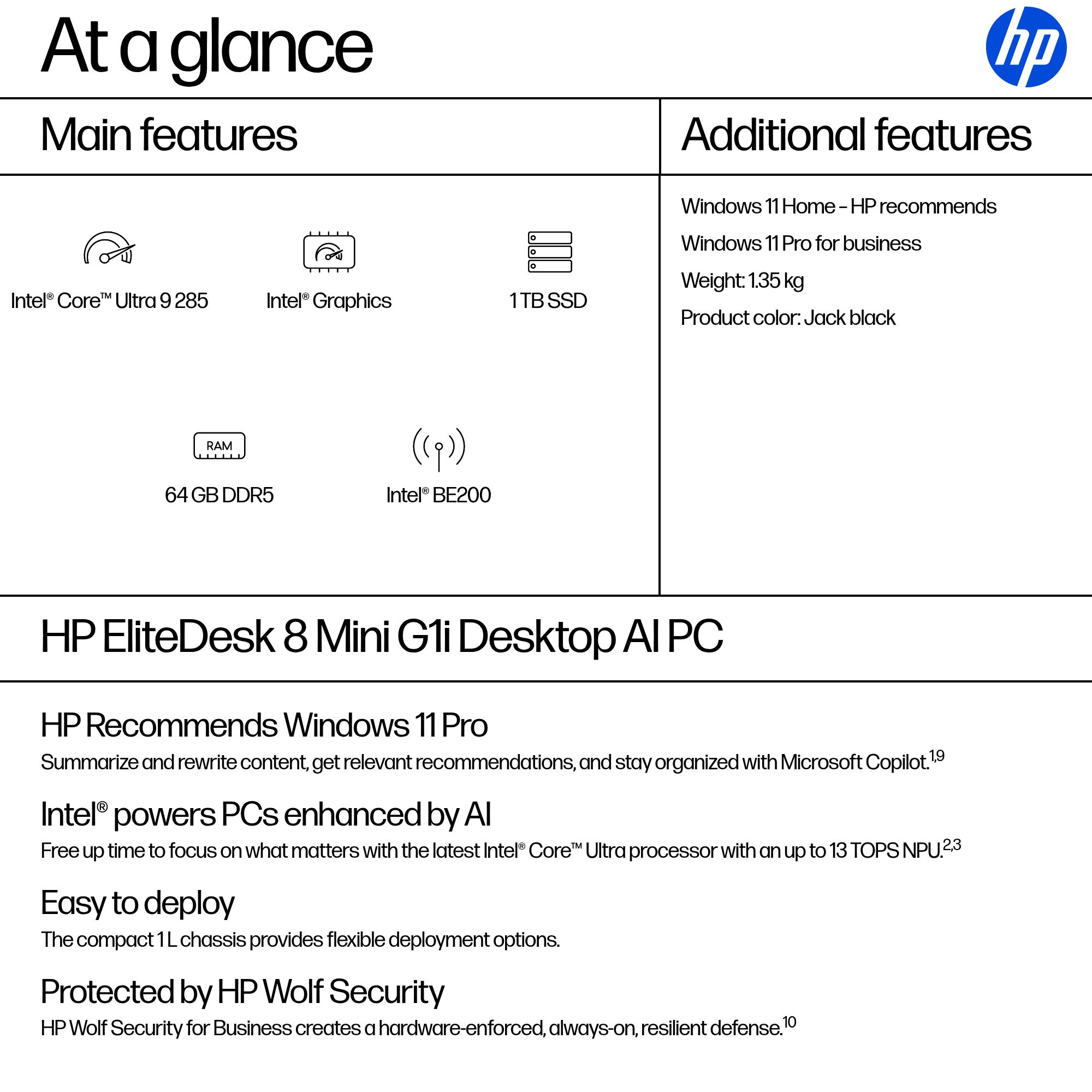 HP EliteDesk 8 Mini G1i AI Intel Core Ultra 9 285 64 GB DDR5-SDRAM 1 TB SSD Windows 11 Home Mini PC AI PC Black