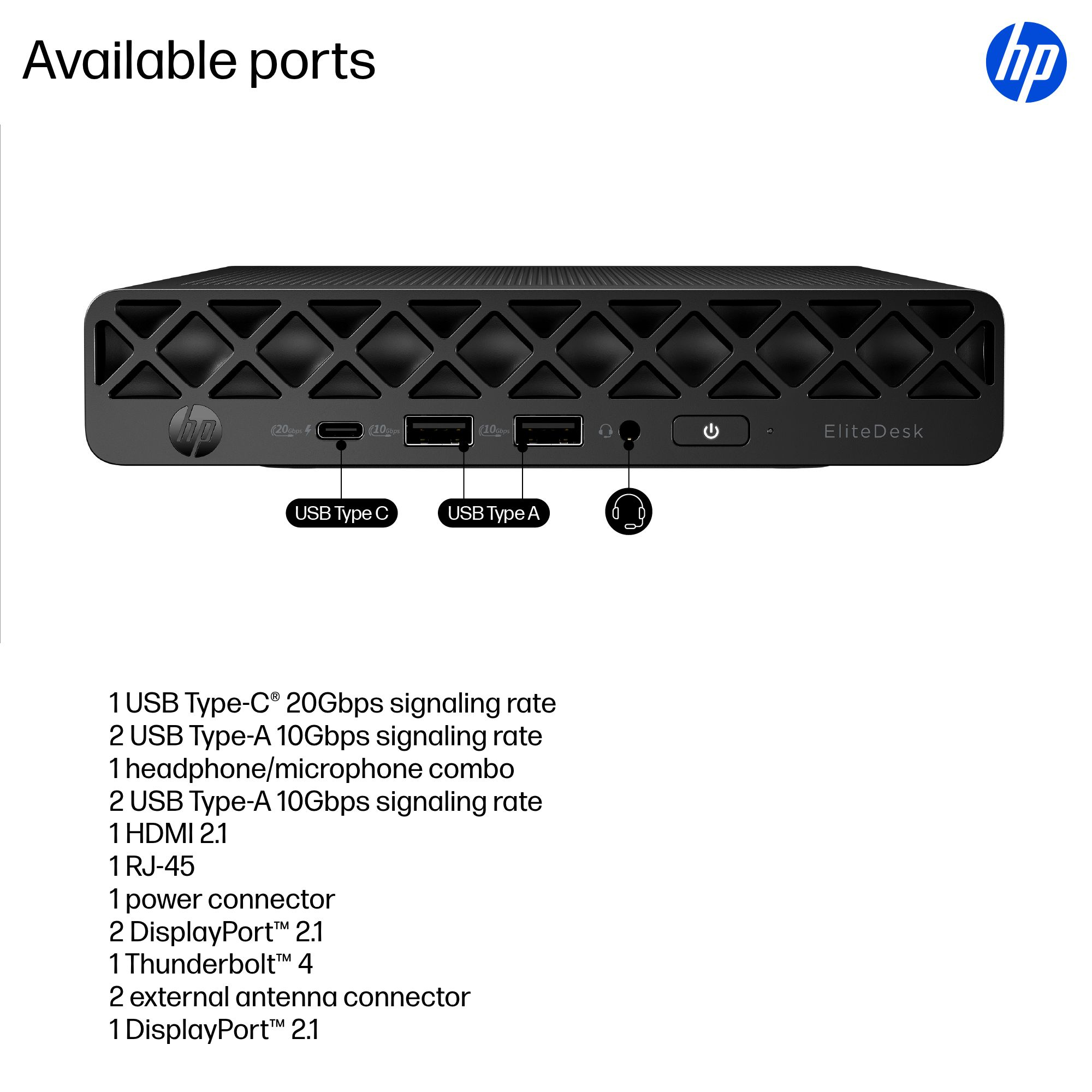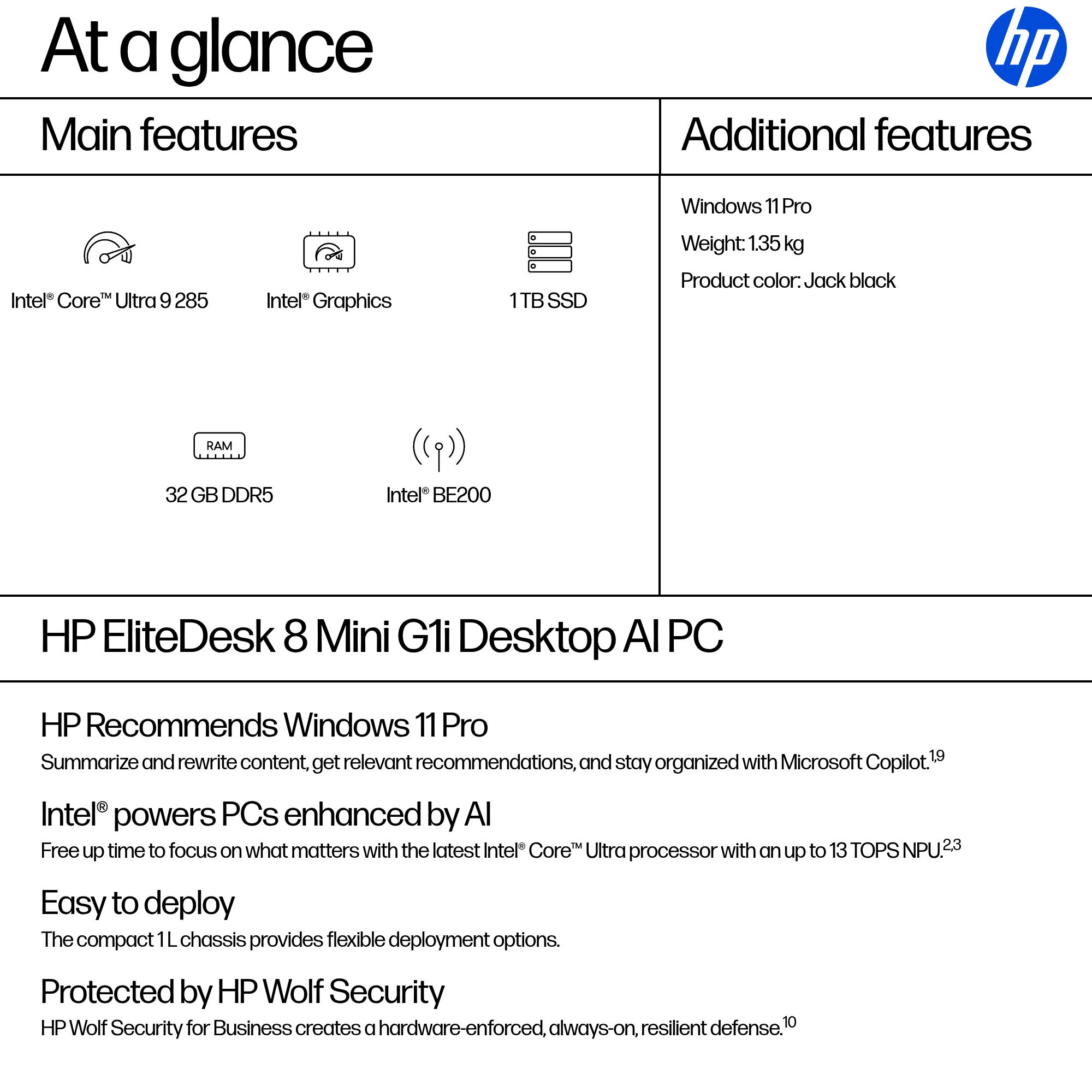 EliteDesk 8 G1i AI - AI PC - mini Core Ultra 9 285 / up to 5.6 GHz - vPro Enterprise - RAM 32 GB - SSD 1 TB - NVMe - Intel Graphics - Gigabit Ethernet, IEEE 802.11ax (Wi-Fi 6), Bluetooth 5.4, IEEE 802.11be (Wi-Fi 7) - Win 11 Pro - monitor: none - keyboard View on InTouch |