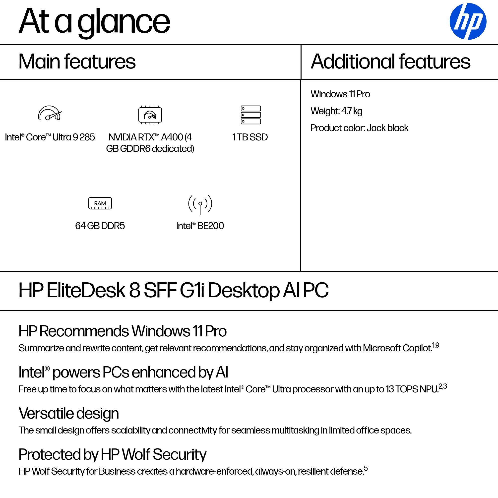 Exceed demanding expectations with the HP EliteDesk 8 SFF G1i AI PC is the perfect choice for small workspaces. Powered by the latest Intel Core™ Ultra processor[2] with a 13 TOPS NPU[3], this secure, scalable, and powerful AI PC tackles your multitasking needs.