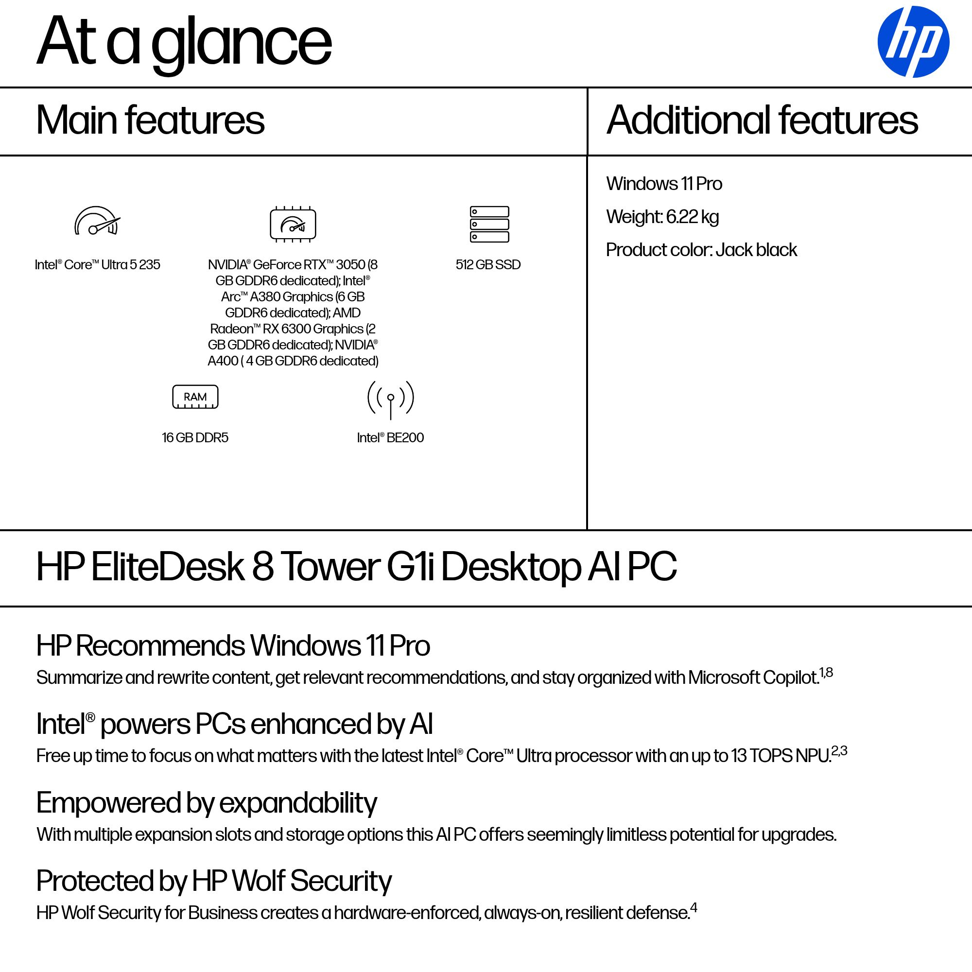 Unleash AI-driven power with the HP EliteDesk 8 Tower G1i AI PC, featuring a powerful Intel Core™ Ultra processor[2] with an integrated 13 TOPS NPU.[3] Elevate your security, expandability, and PC design to new heights — perfect for dynamic, modern workspaces.