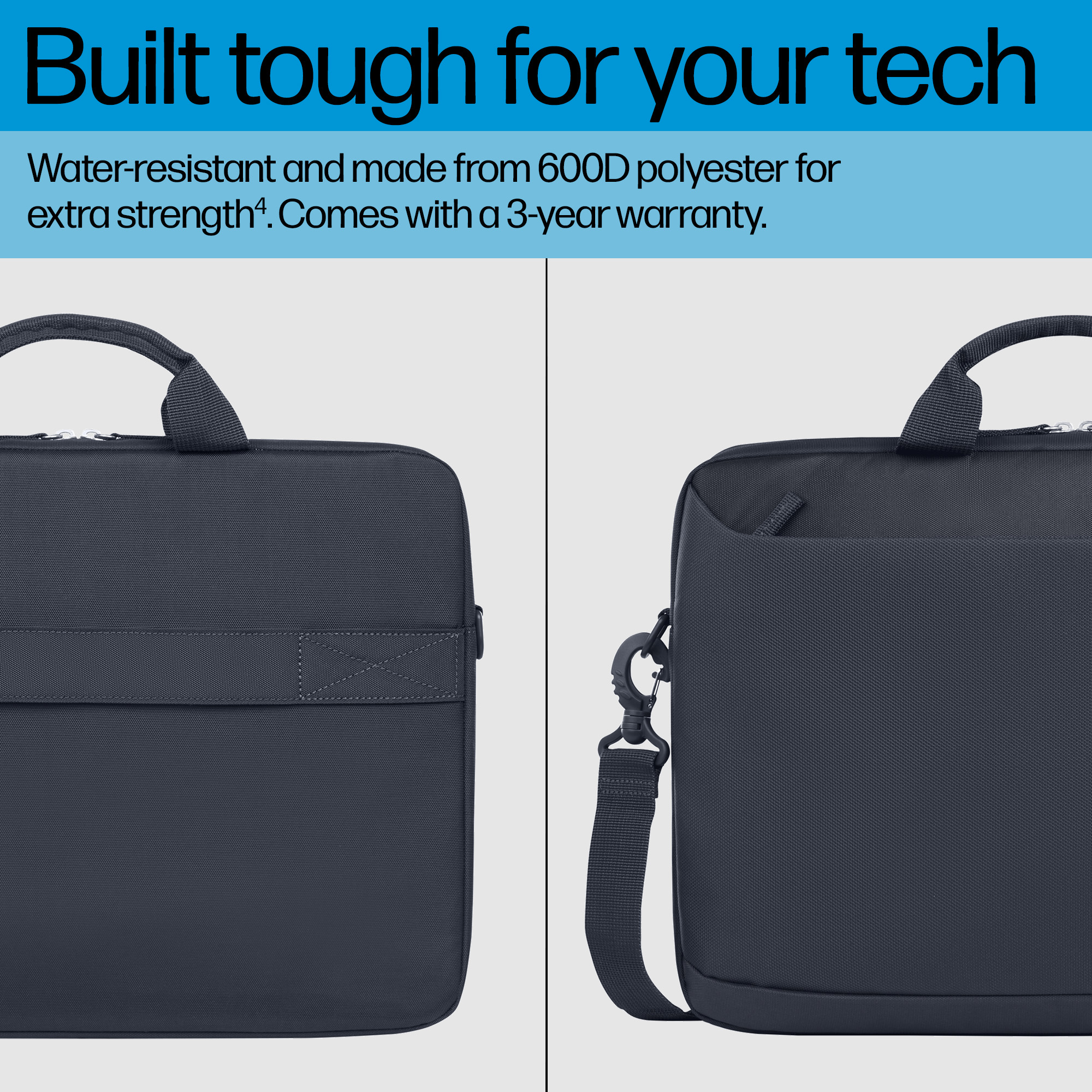 Feel confident your tech is protected when you're on the move with this durable 14-inch laptop briefcase.<sup>[1]</sup> Water-resistant and made from 600D polyester for extra strength<sup>[2]</sup>, it includes a padded laptop compartment to guard against bumps and scratches and comes with a 3-year warranty.