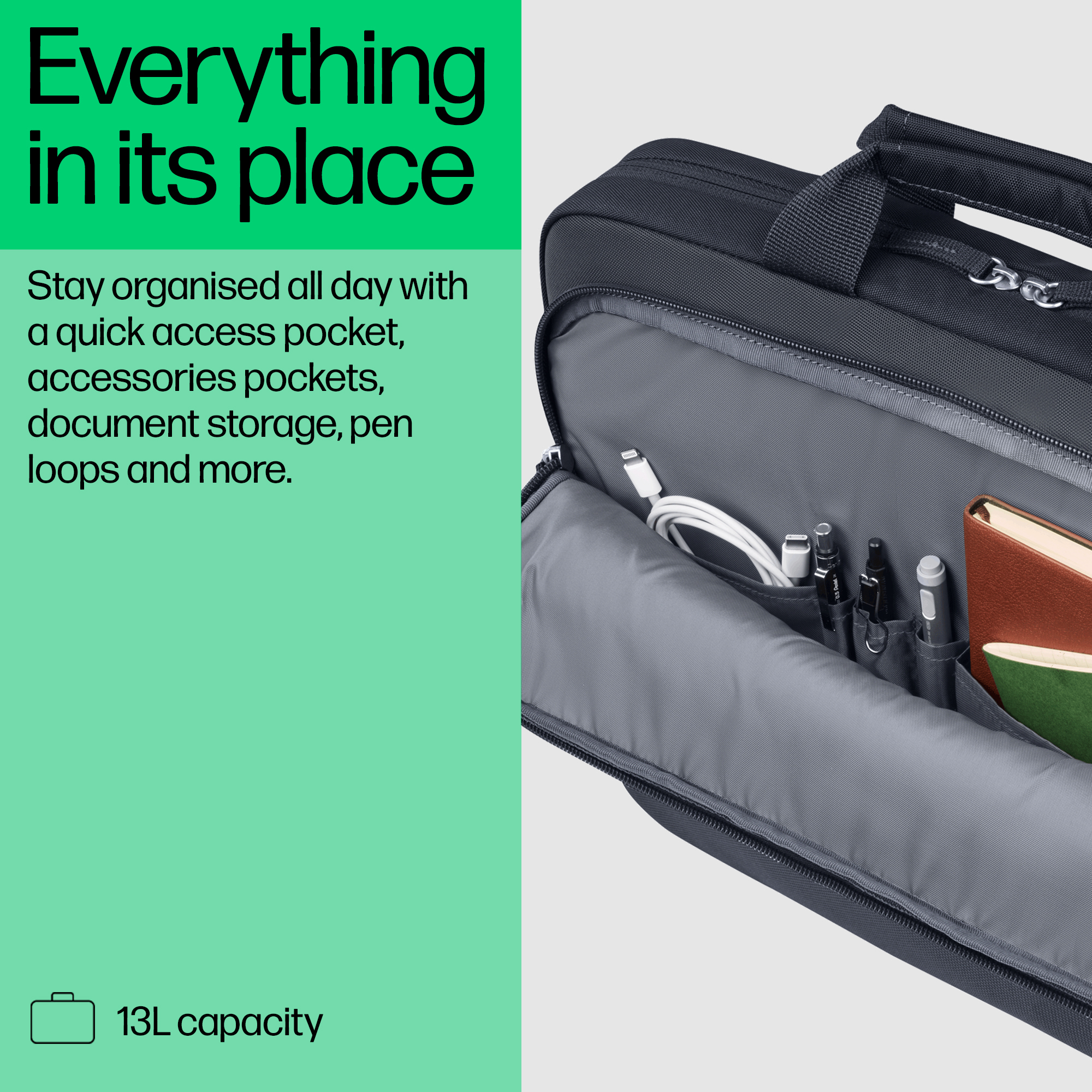 Stay organized all day, every day with 13L of storage space and two compartments for all your essentials. Store everything in its dedicated place with a quick access pocket, accessories pockets, document storage, pen loops, and more.