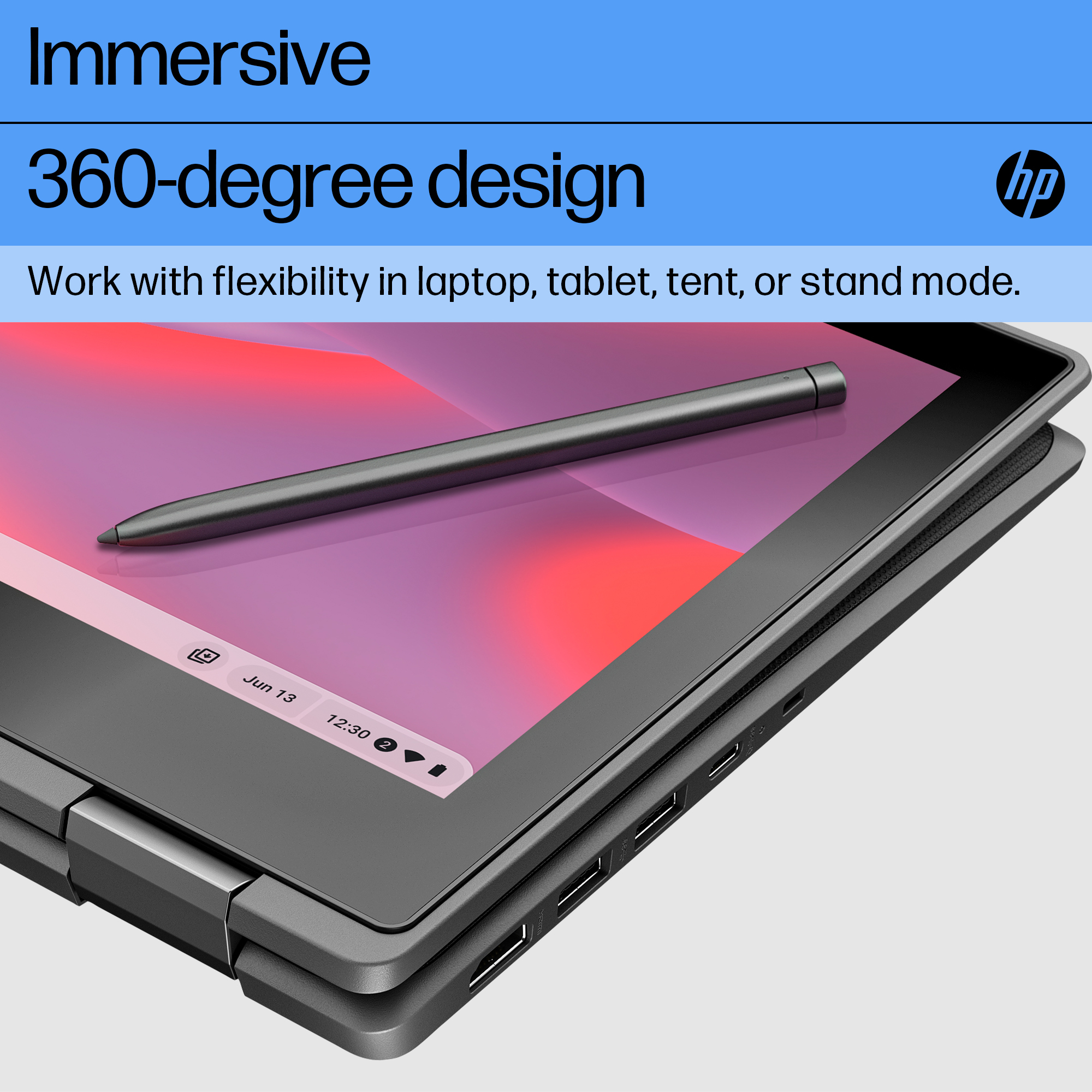 The rugged HP Fortis Flip Chromebook provides reliability and performance in a rugged 360-degree design. It features an Intel quad-core processor[8], plenty of memory, and long battery life for productivity throughout the day. The 360-degree hinge allows multiple modes of use, while enhanced durability testing gives you peace of mind.