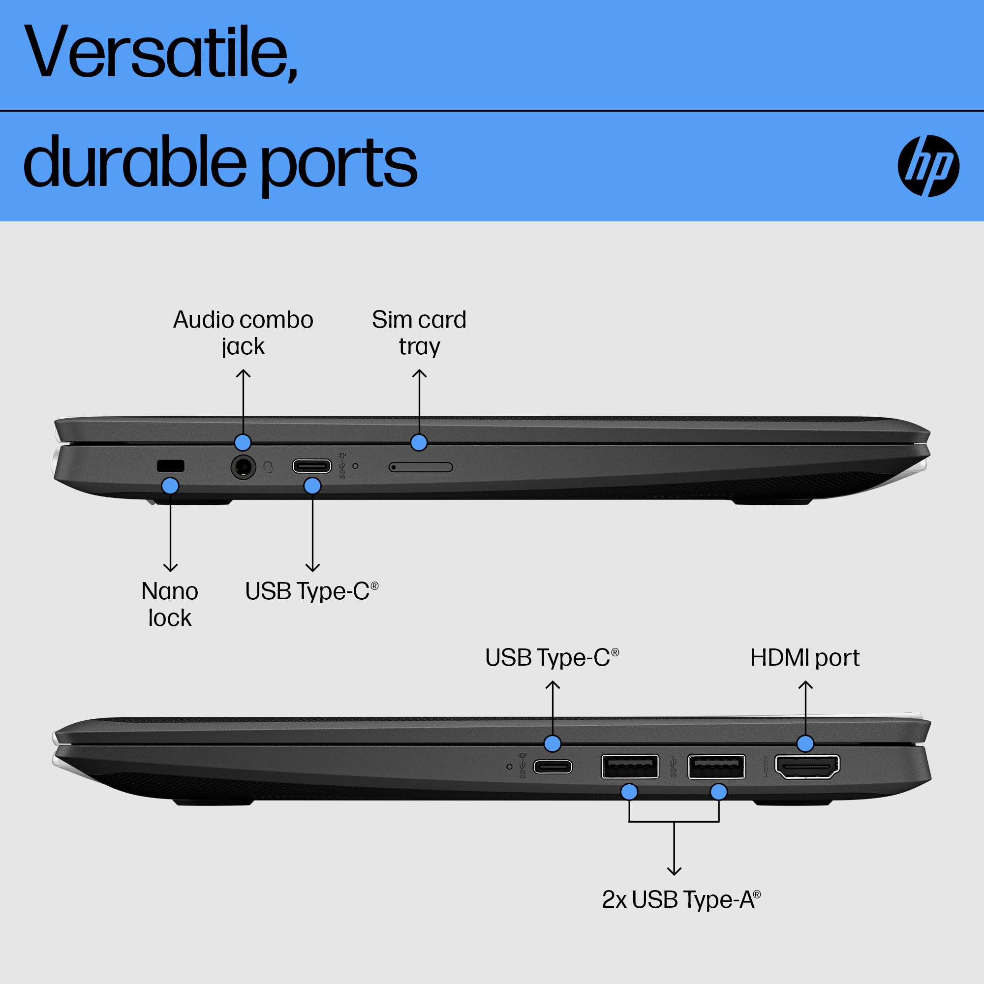 Stay connected, even in crowded wireless networks, with a fast, reliable wireless connection. This Fortis Chromebook’s Wi-Fi 6E or optional Wi-Fi 6 wireless LAN comes with MU-MIMO, HP Extended Range Wireless LAN, and supports Bluetooth® technology.[6]