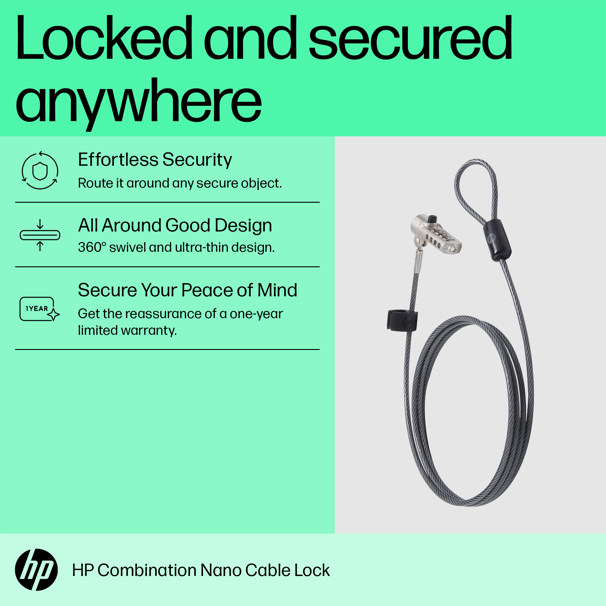 Keep your laptop locked in and secured with the HP Combination Nano Cable Lock, designed for any HP notebook with a nano lock slot[1]. Loop and lock with a unique pre-set combination for keyless, worry-free security almost anywhere.