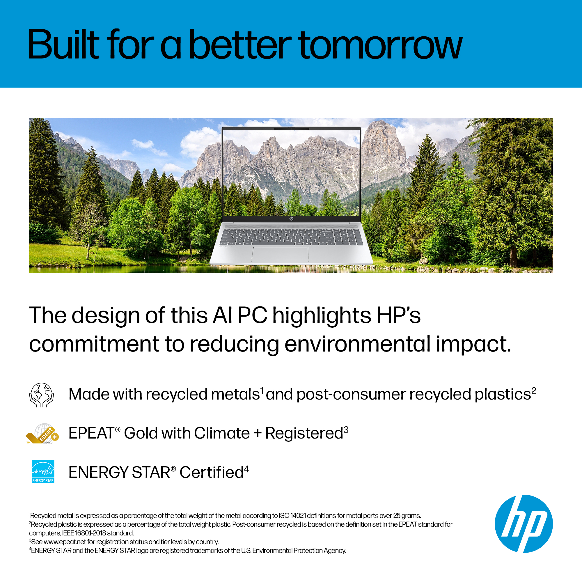 The HP OmniBook 5 Laptop AI incorporates recycled materials<sup>[6]</sup> and is EPEAT® Gold with Climate+<sup>[7]</sup> certified.
