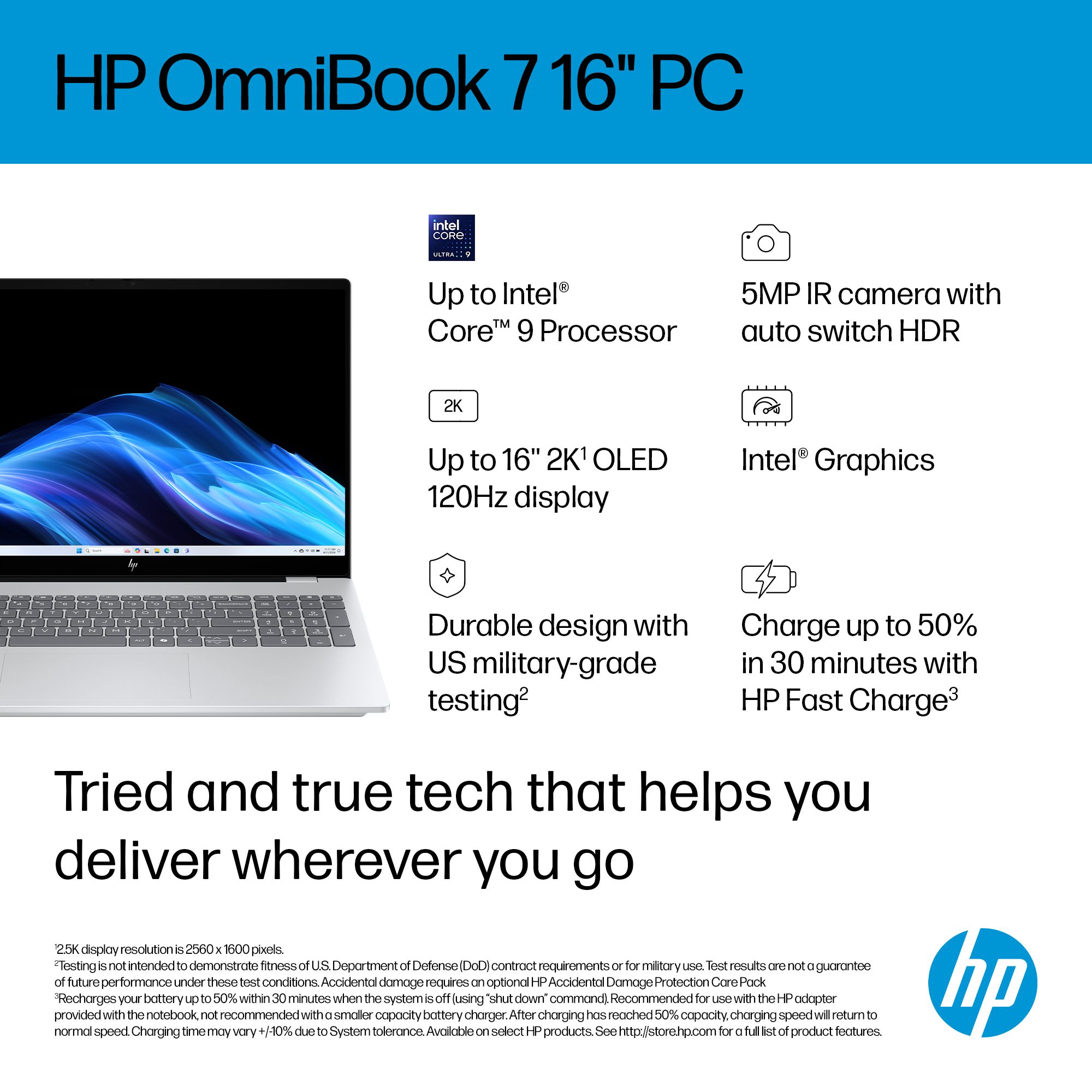 Tough enough to meet demanding US military-grade standard testing[1], HP OmniBook 7 16 delivers durability, performance, and portability, powered by the Intel Core™ Processor[2] and a brilliant 16” display[6].