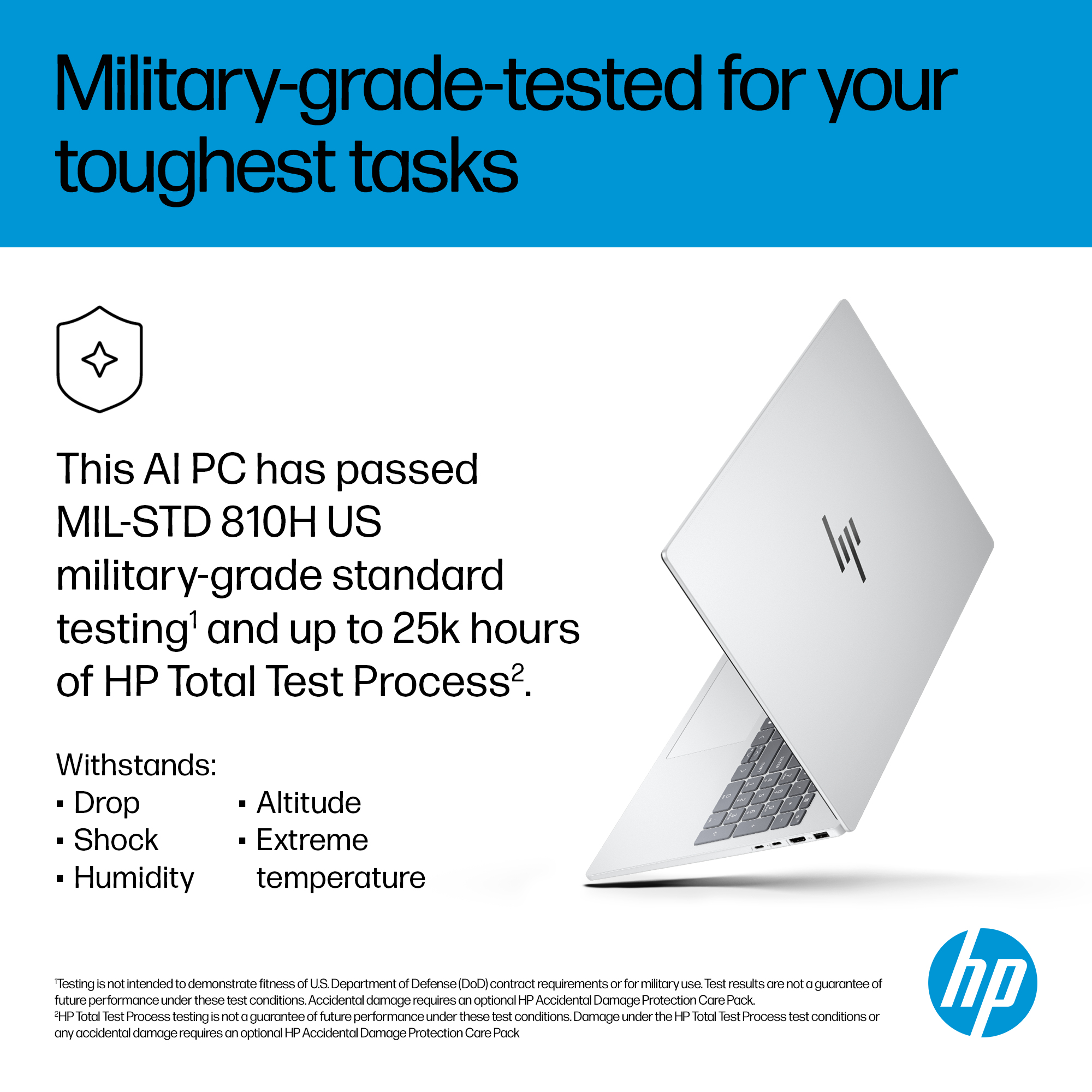 Tough enough to meet demanding US military-grade standard testing[1], HP OmniBook 7 16 AI PC delivers durability, performance, and portability, powered by the latest AI-enhanced Intel Core™ Ultra Processor[2] and a brilliant 16” display[5].