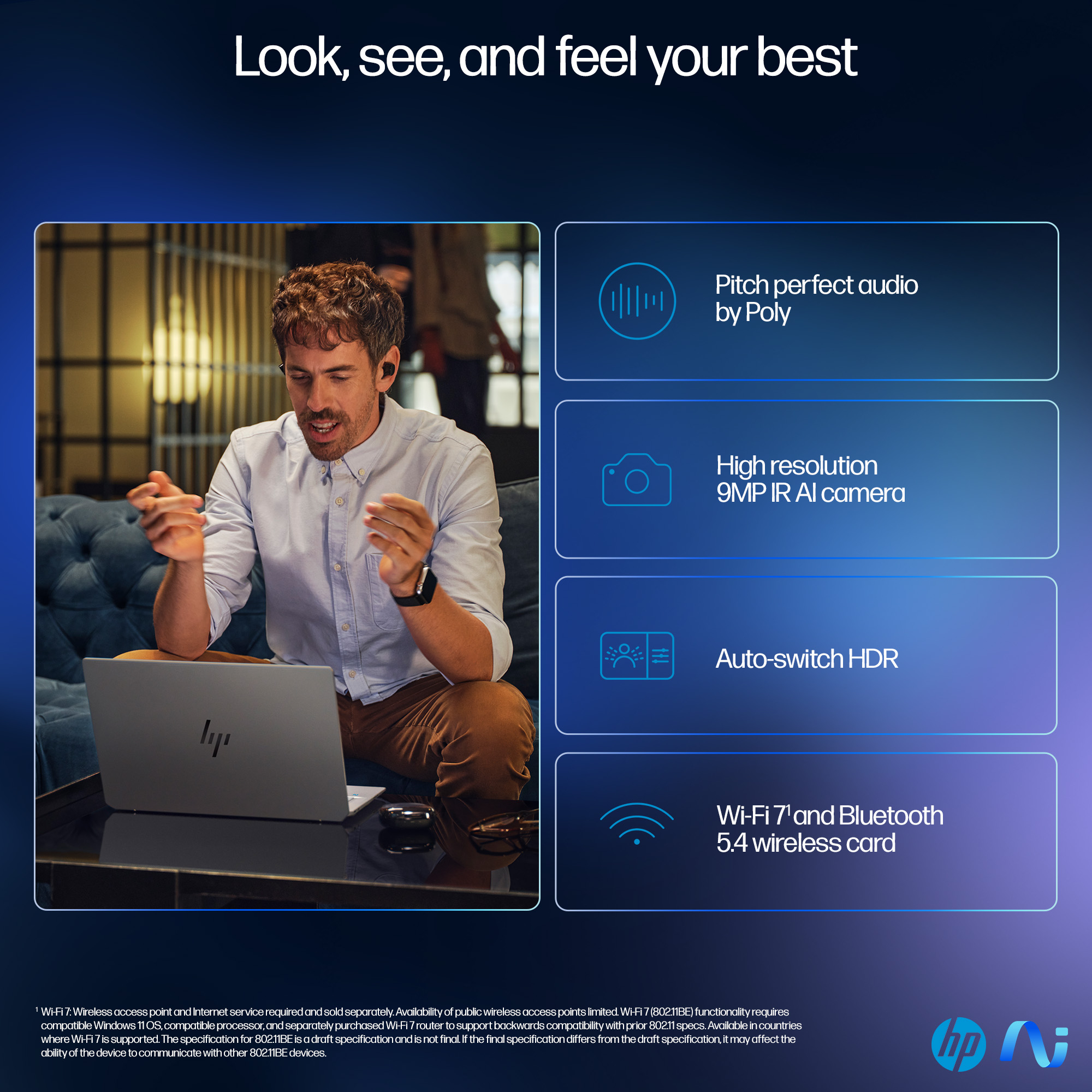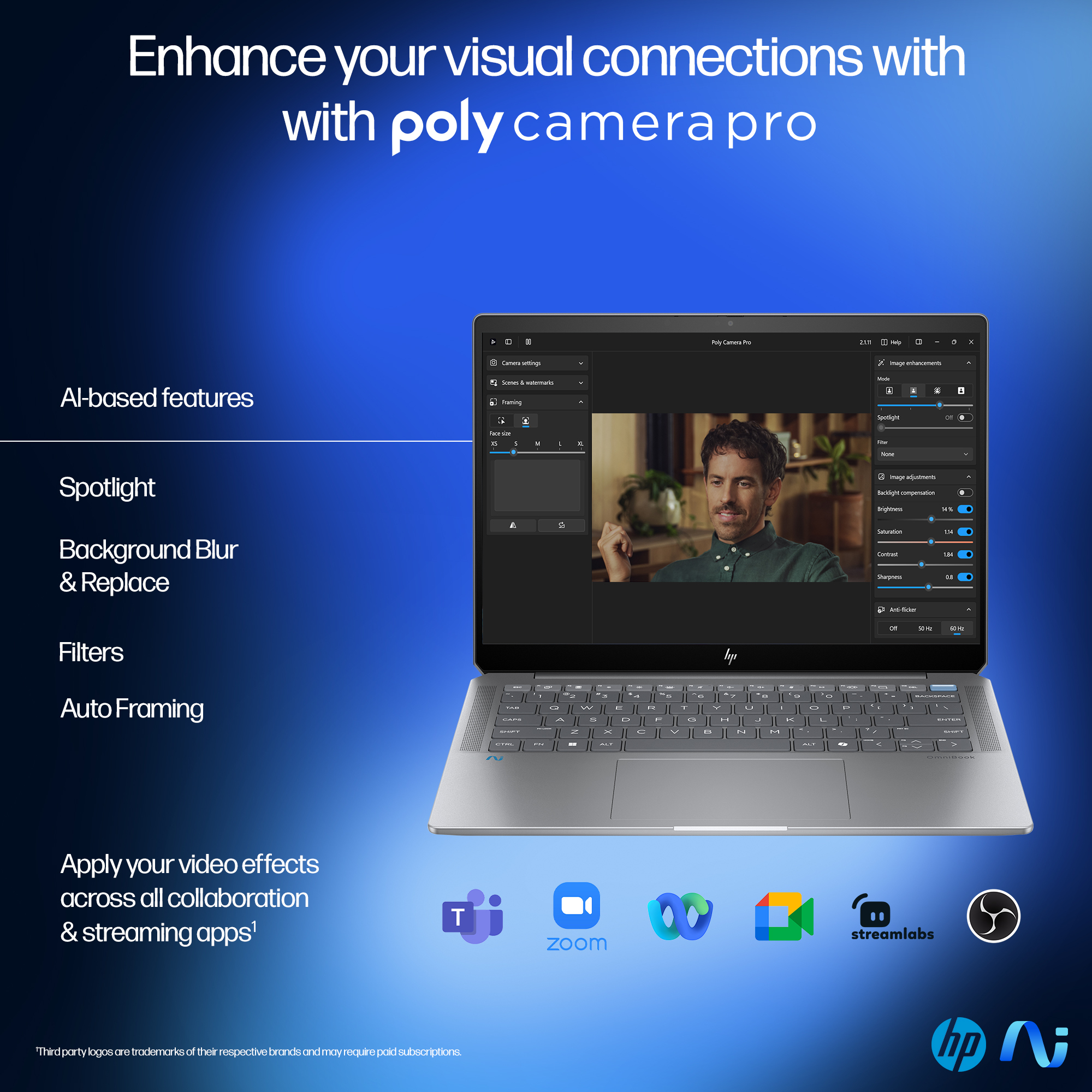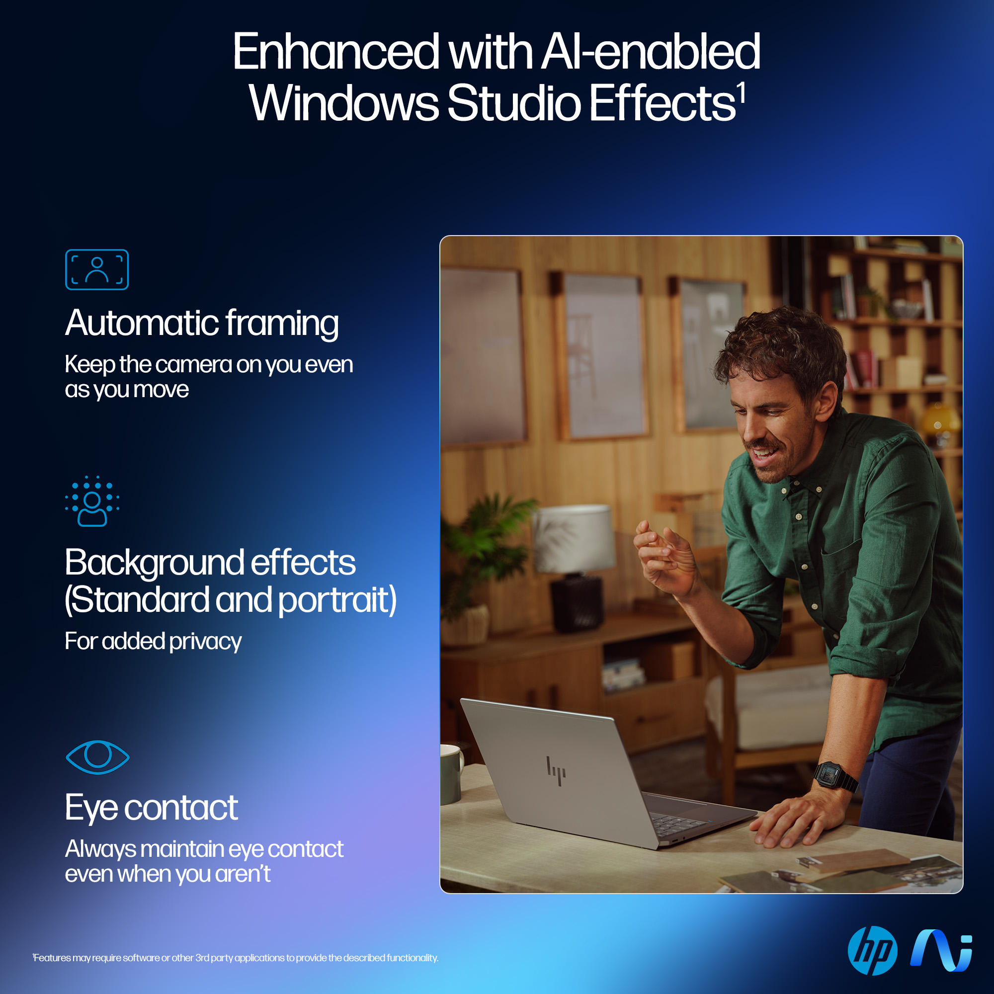 Enjoy seamless collaboration with a 9MP camera, Poly Camera Pro app, Wi-Fi 7<sup>[4]</sup>, and Windows Studio Effects<sup>[5]</sup>.
