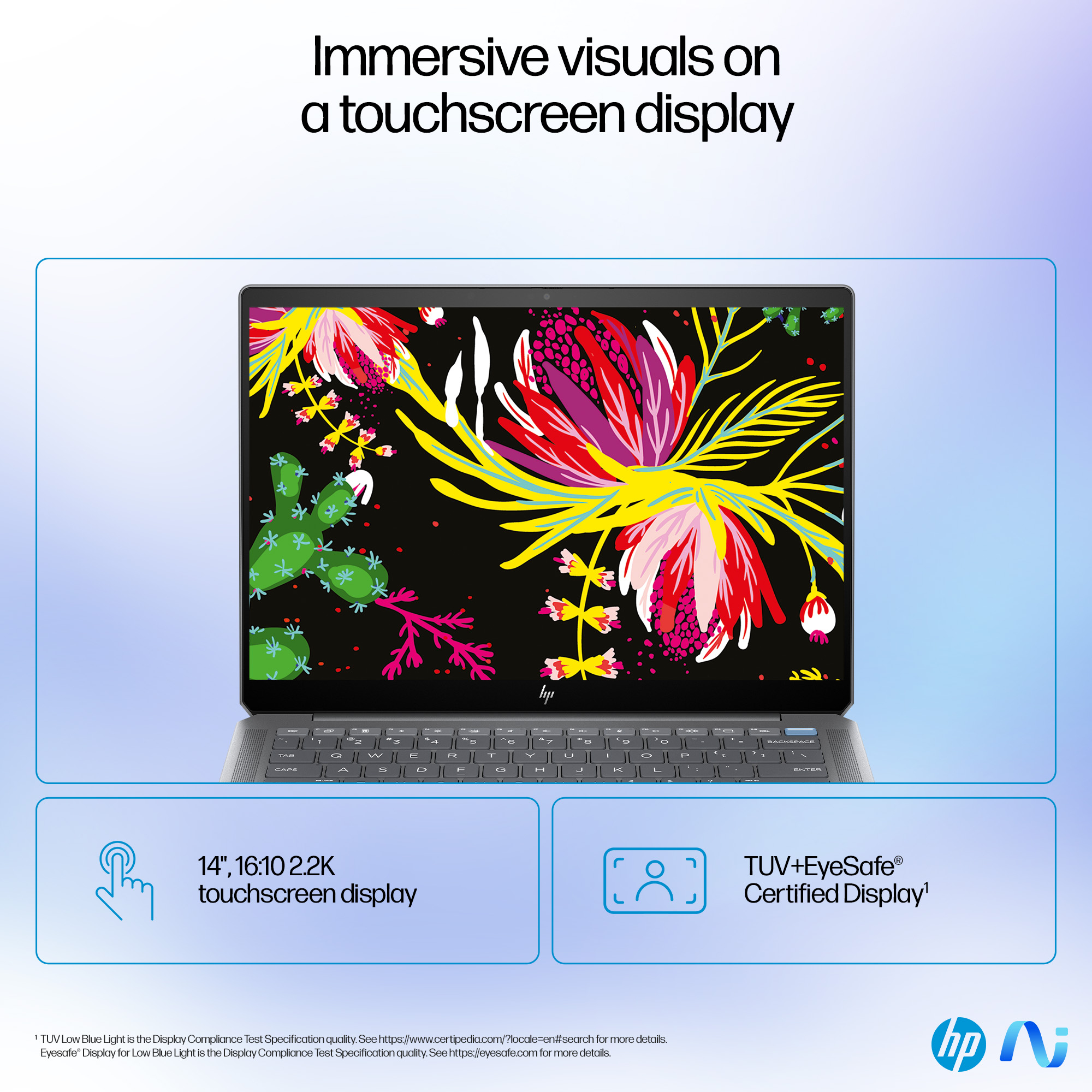 14 inch Eyesafe® Certified Display with a 16:10 aspect ratio for creating and editing content, and intuitive touchscreen technology to control your PC directly.[11]