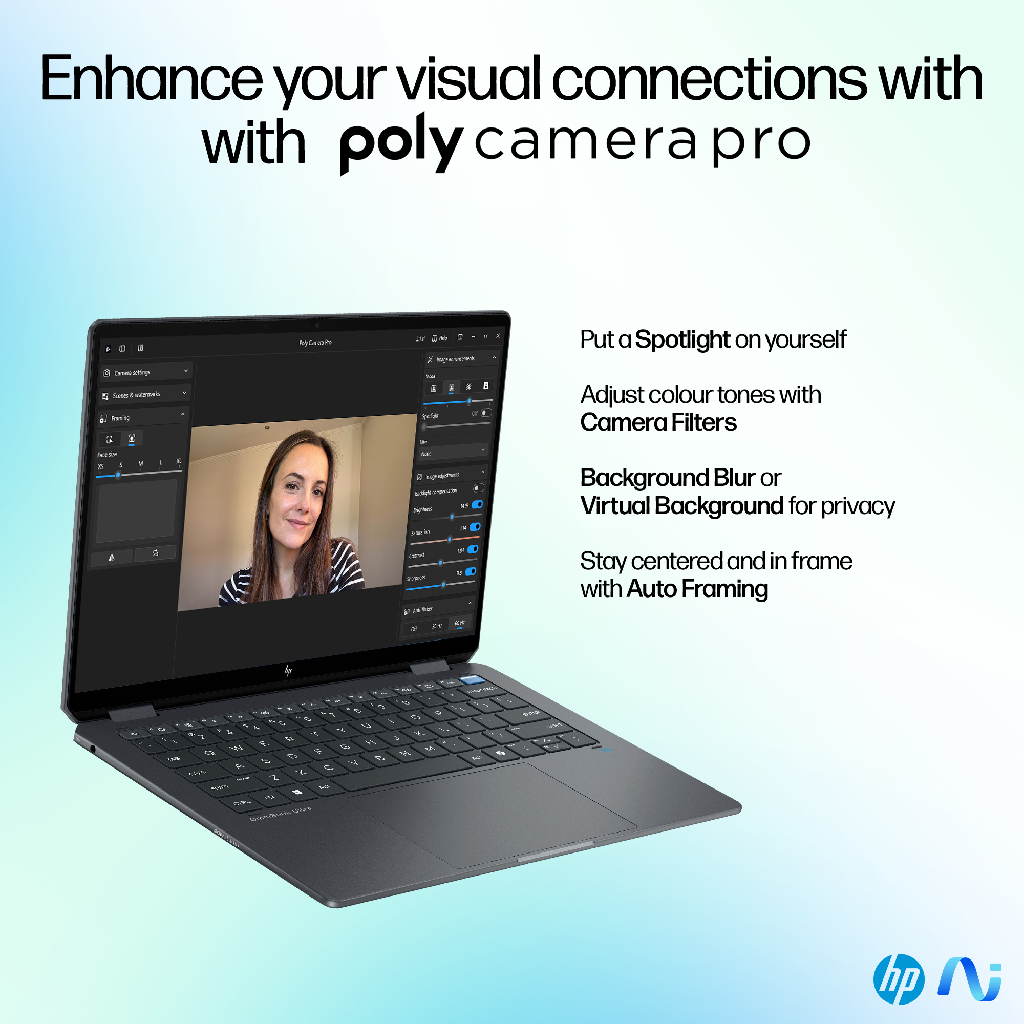 Truly connect with the AI-enabled 9MP camera, Windows Studio Effects<sup>[4]</sup>, Wi-Fi 7<sup>[5]</sup> and Poly Camera Pro.