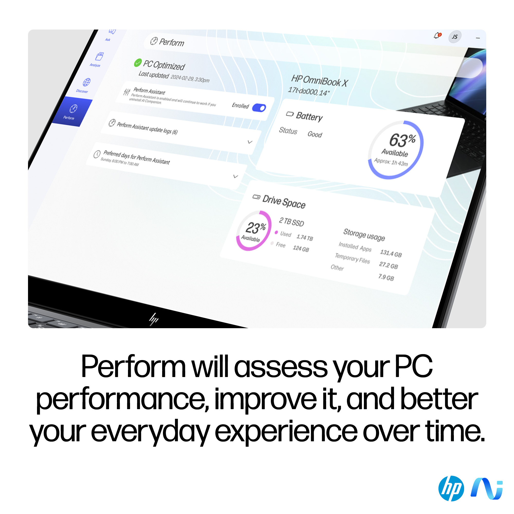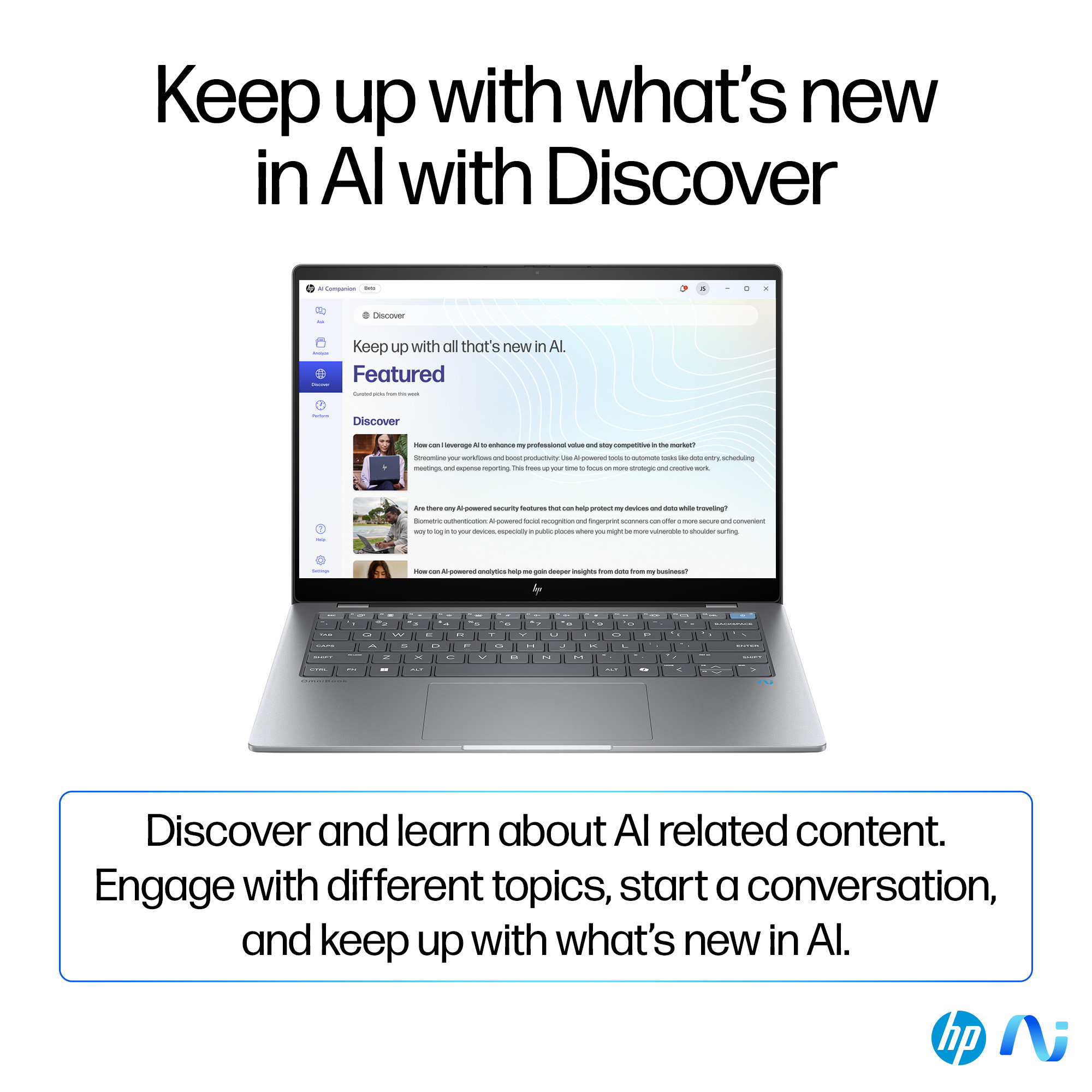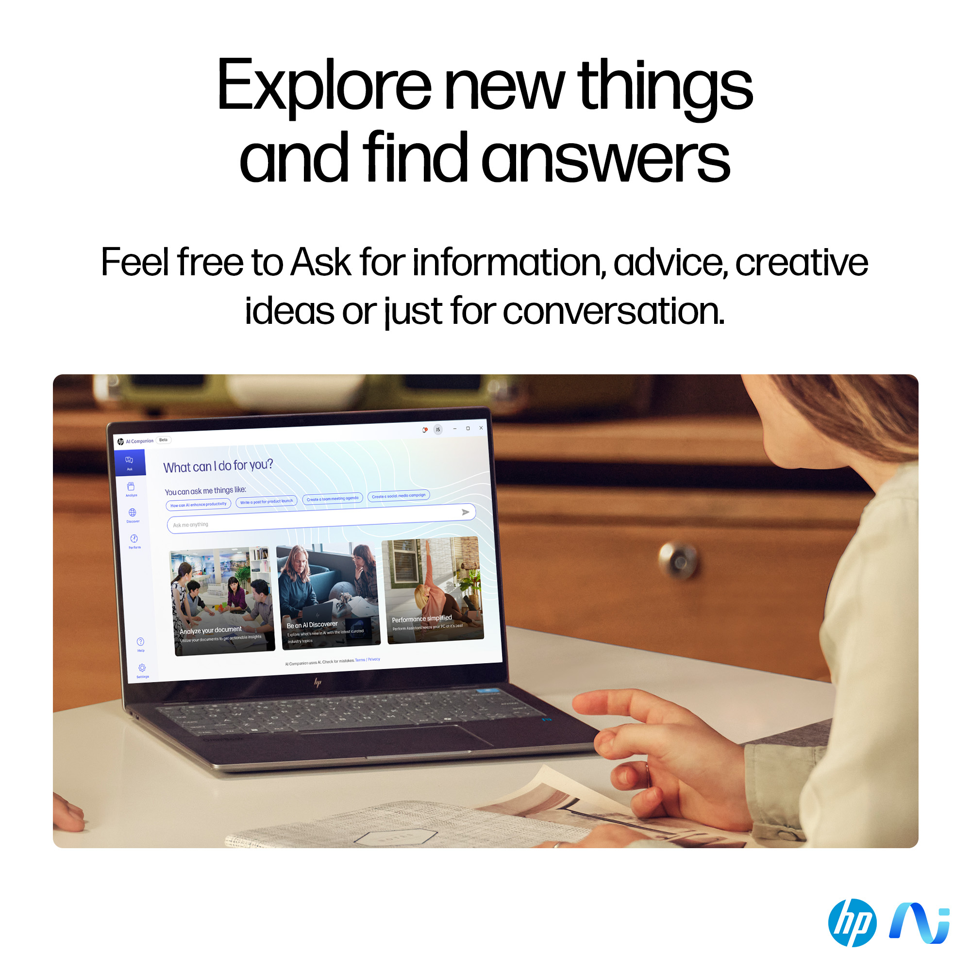 Get the most out of your AI PC with the new HP AI Companion app. Elevate your everyday tasks with a collection of AI tools and solutions that can increase your productivity and keep you running at your best.<sup>[12]</sup>