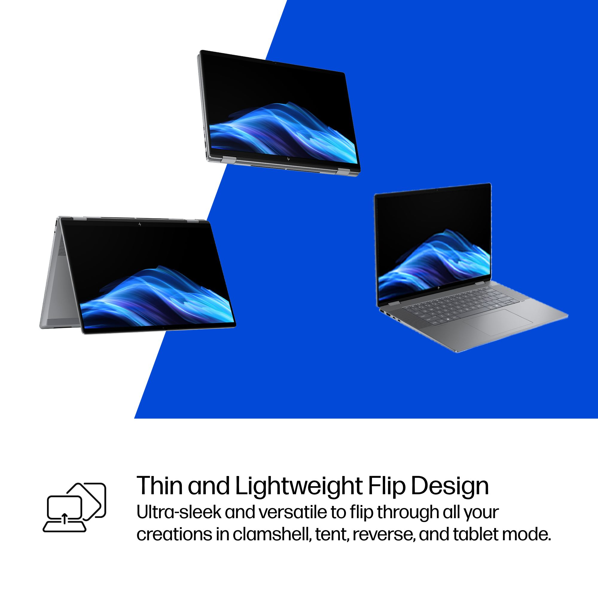 Whether you’re creating or being entertained, the versatile HP OmniBook X Flip 16 Next Gen AI PC, with a vibrant 16" edge-to-edge touch display[4] that can be used flipped, folded, or flat ensures that it’s also the most comfortable and productive. Designed in style with recycled metal[1] and a modern backlit keyboard with large keycaps.