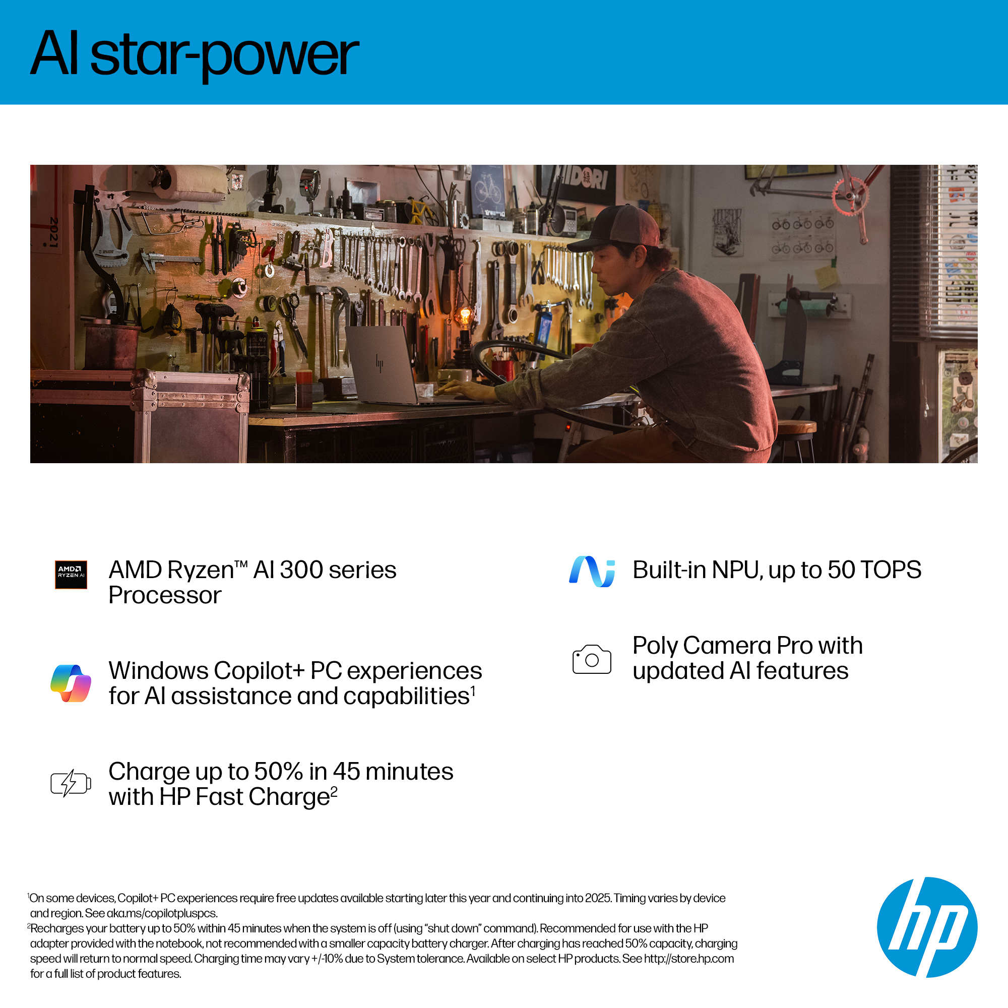 Unlock transformational AI PC experiences with AMD Ryzen™ AI 300 series processors. Designed for users to experience pure speed, responsiveness, and power efficient AI processing for Copilot+ PCs.<sup>[6]</sup>