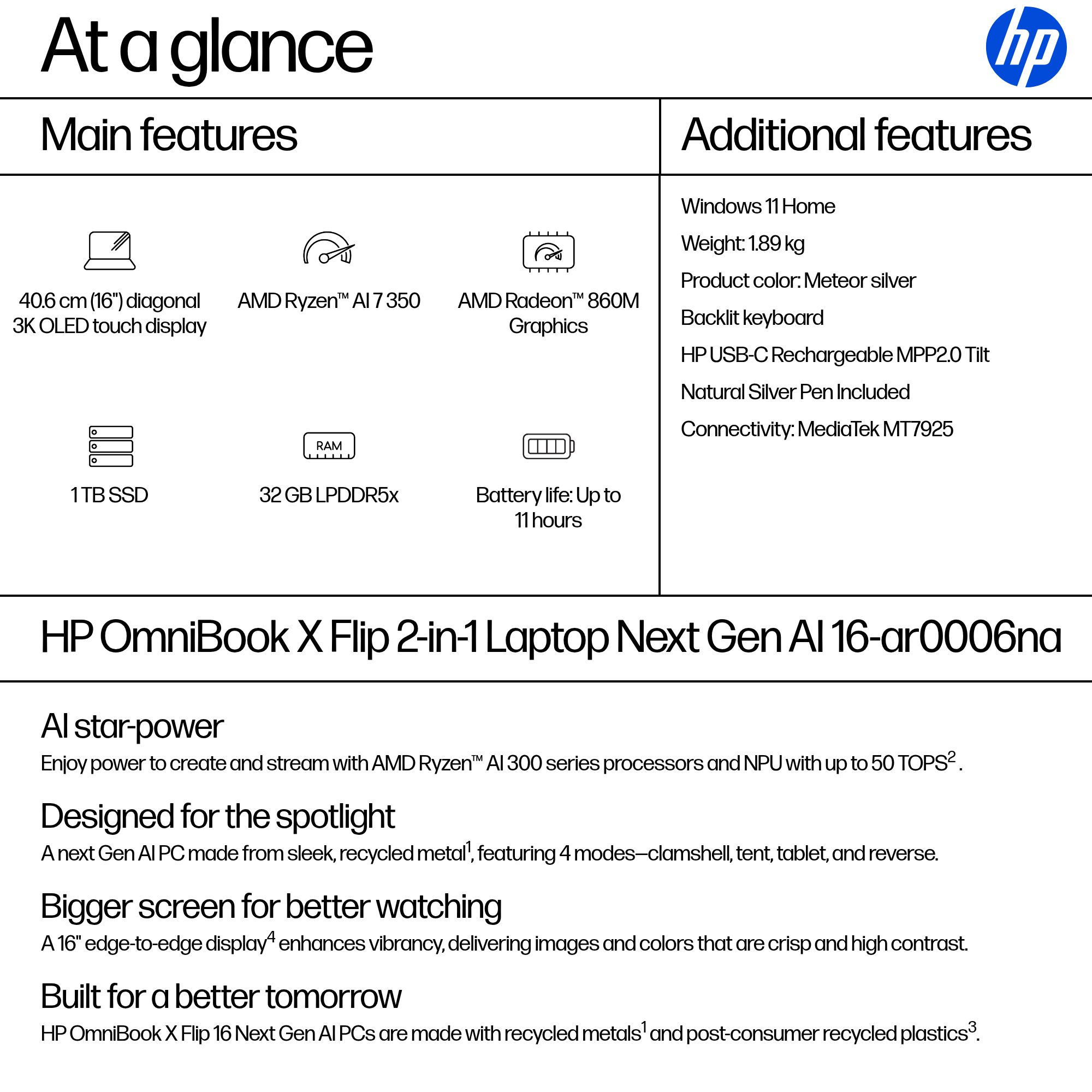 HP OmniBook X Flip 16-ar0006na Copilot+ PC AMD Ryzen™ AI 7 350 Hybrid (2-in-1) 40.6 cm (16") Touchscreen 3K 32 GB LPDDR5x-SDRAM 1 TB SSD Wi-Fi 7 (802.11be) Windows 11 Home Silver