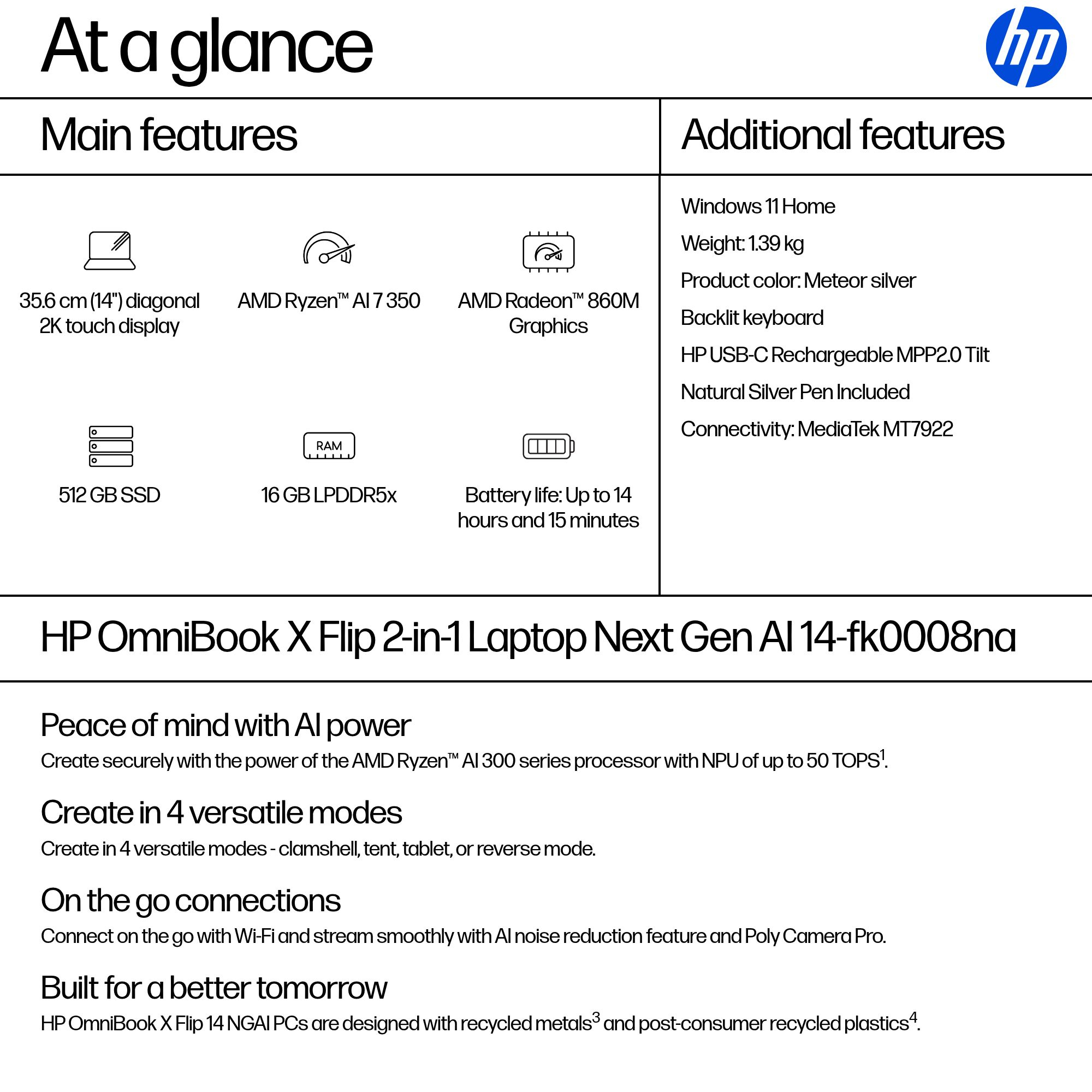 HP OmniBook X FlipNGAI 14-fk0008na Copilot+ PC AMD Ryzen™ AI 7 35.6 cm (14") Touchscreen 2K 16 GB LPDDR5x-SDRAM 512 GB SSD Wi-Fi 6E (802.11ax) Windows 11 Home Silver