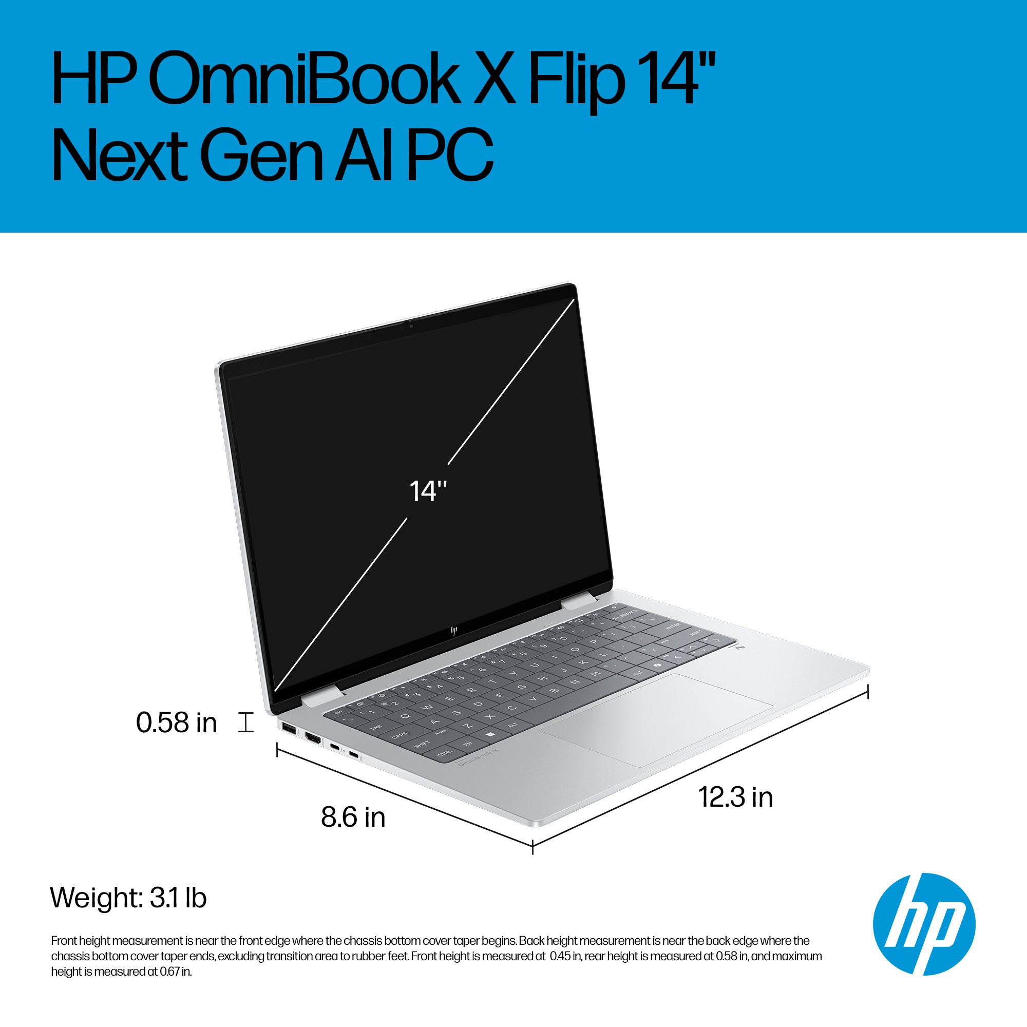 The thin and light HP OmniBook X Flip 14 Next Gen AI PC enables creatives to work and play from any angle with multiple modes, and features a high-resolution edge-to-edge display for crisp, clear images, an AI-powered processor, and an all-day, fast-charging battery for the speed, performance, and endurance to create wherever you are.
