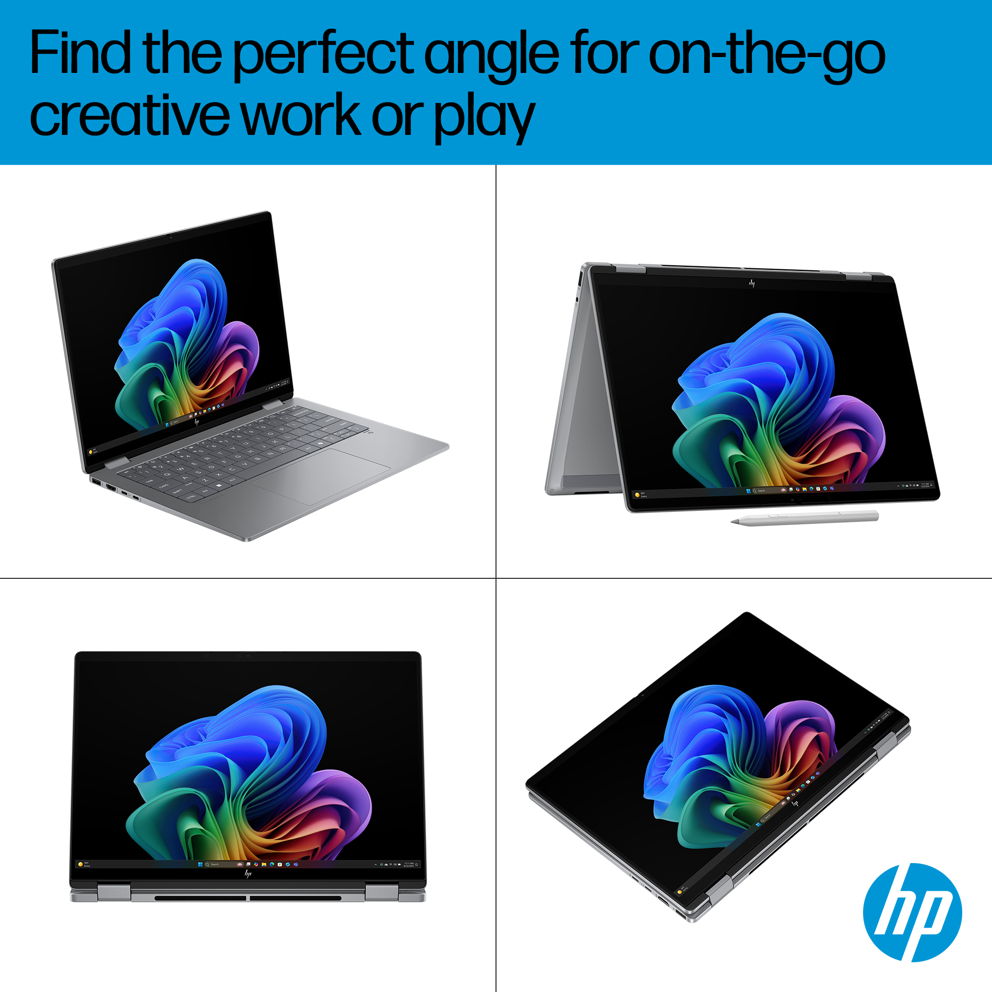 The thin and light HP OmniBook X Flip 14 Next Gen AI PC enables creatives to work and play from any angle with multiple modes, and features a high-resolution edge-to-edge display for crisp, clear images, an AI-powered processor, and an all-day, fast-charging battery for the speed, performance, and endurance to create wherever you are.