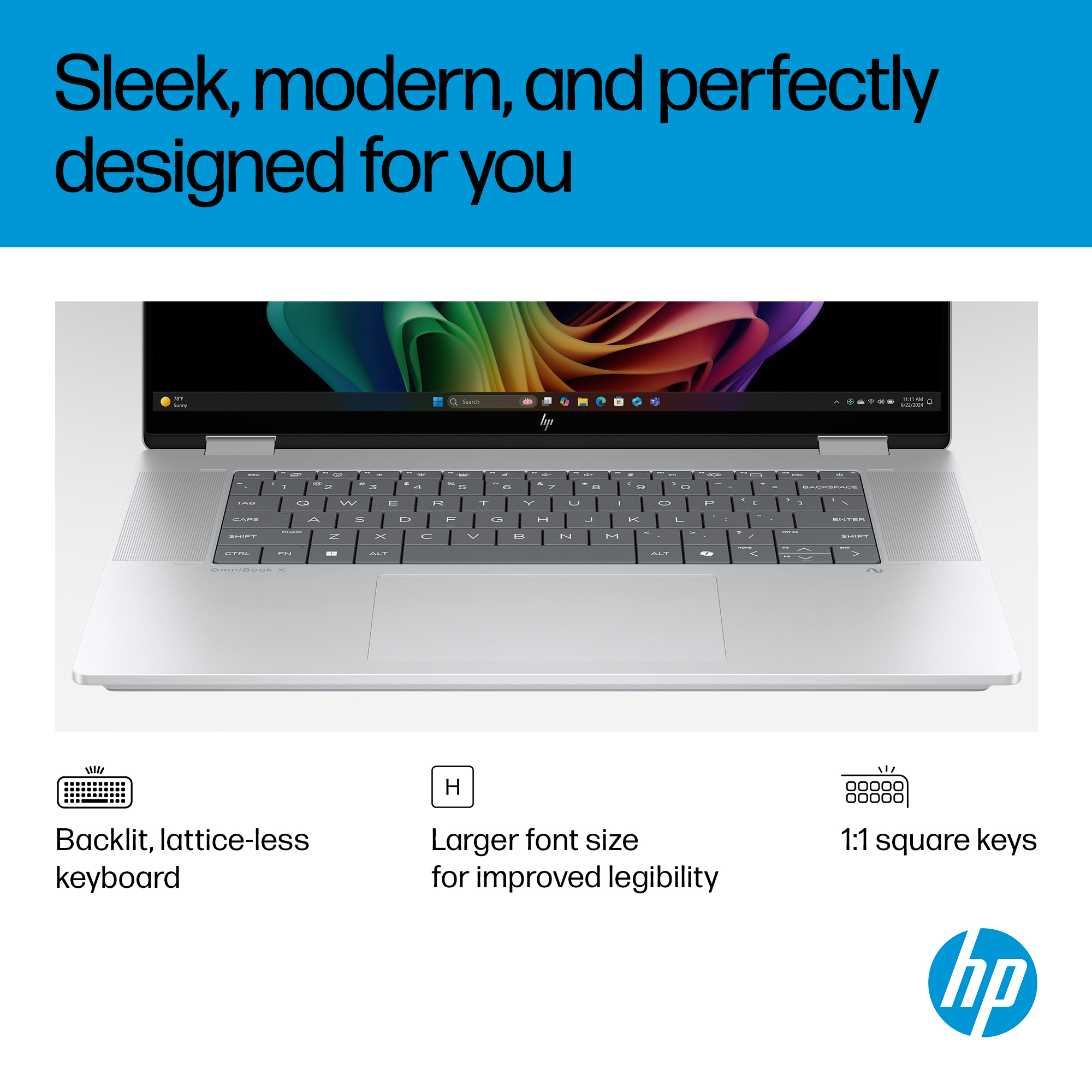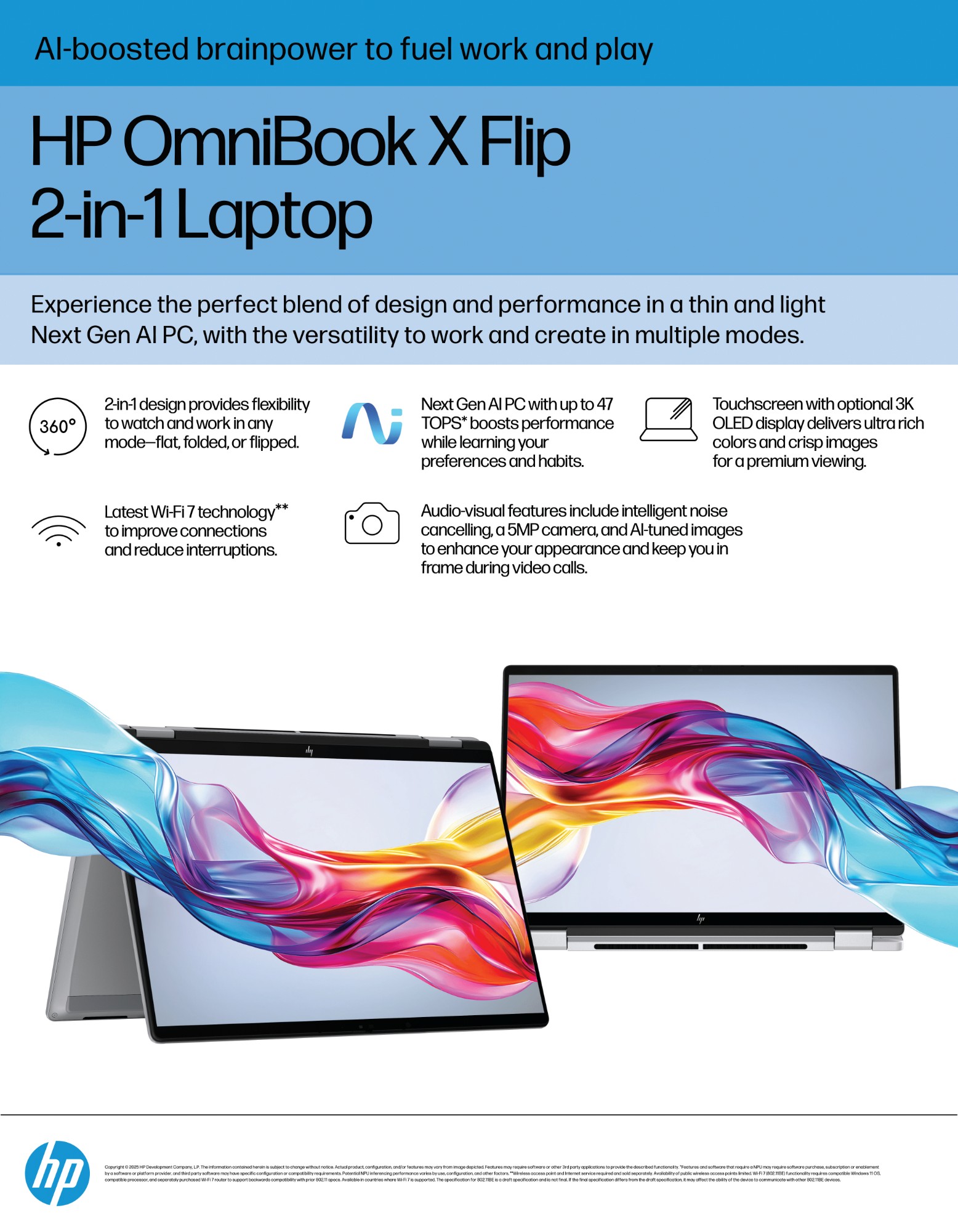 The HP OmniBook X Flip 16 NGAI PC combines AI-powered speed and performance for creative work and entertainment. Its large 16” display[5] adapts to your viewing needs—flat, folded, or flipped—offering vibrant colors from every angle. Designed with a sleek recycled metal[1] chassis and backlit keyboard with large keycaps for an elevated experience.