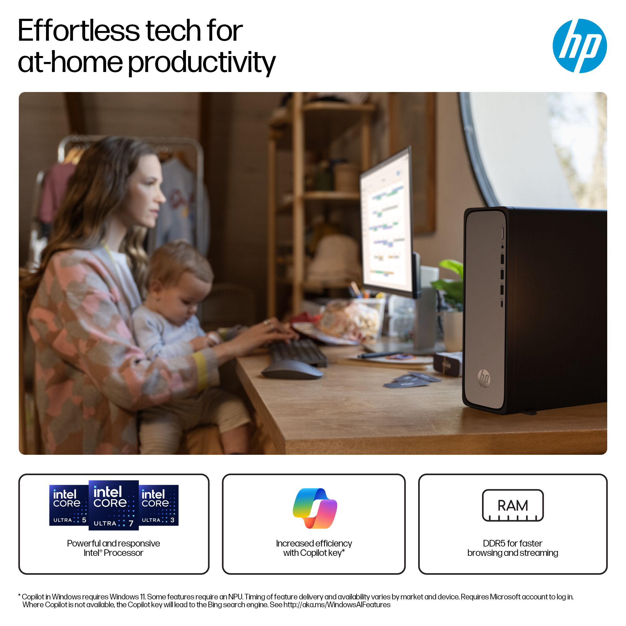 HP OmniDesk Slim Desktop helps easily manage daily tasks, from organizing family photos to streaming shows and managing budgets. This slim and reliable desktop PC features the latest Intel Processors[1], ample memory for fast data transfers, the latest easy-access ports and fast, reliable Wi-Fi technology[3].
