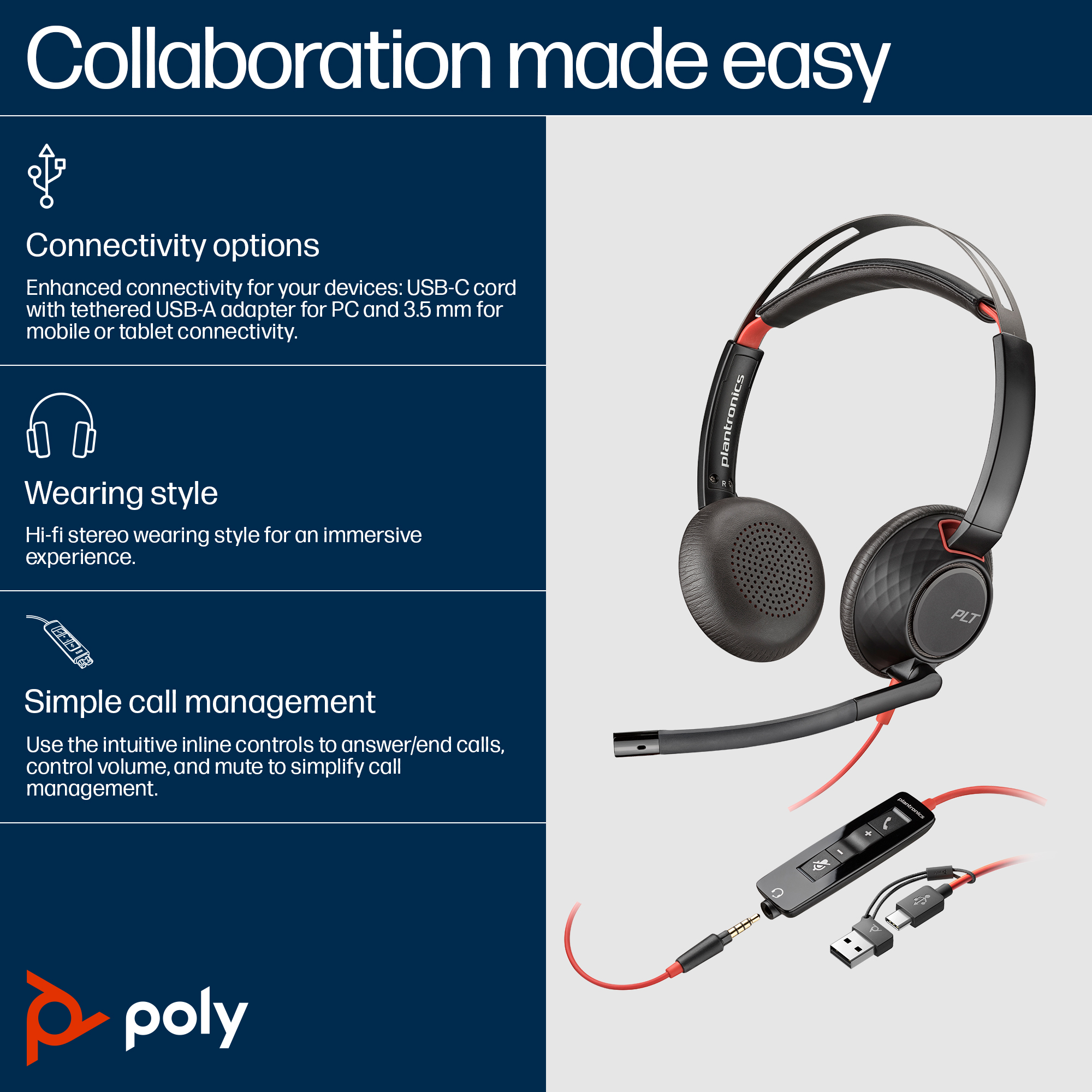 Poly Blackwire 5220 - Headset - on-ear - wired - USB-C, 3.5 mm jack - black - Certified for Skype for Business, Cisco Jabber Certified, Avaya Certified, Certified for Microsoft Teams, Zoom Certified, UC certified, Works With Chromebook Certified View on InTouch open_in_new |