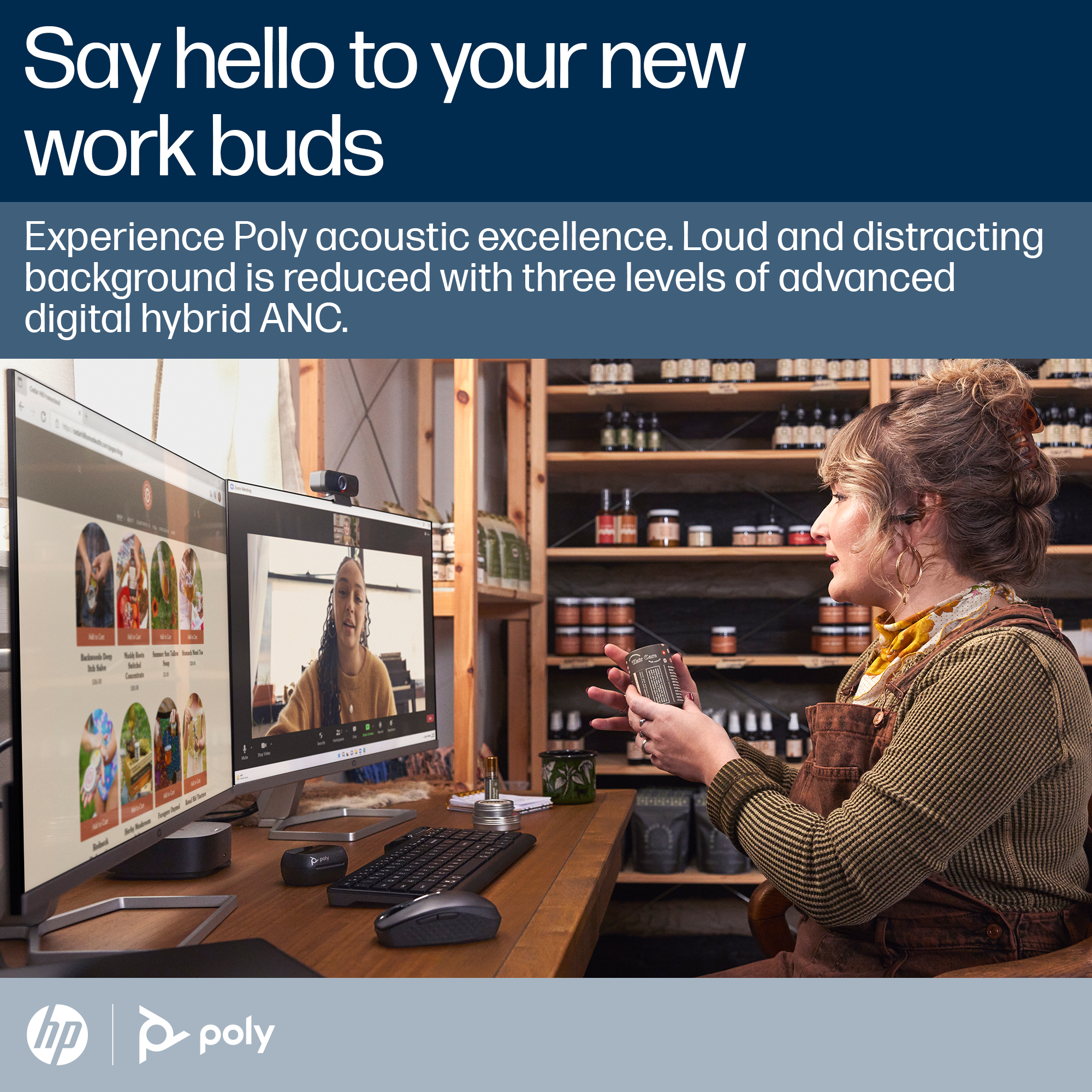 Each bud has a three-mic array that triangulates on your voice and minimizes surrounding noise so you’re always loud and clear. Whether you are in a video meeting or a call, these wireless earbuds are designed to keep you productive and connected.