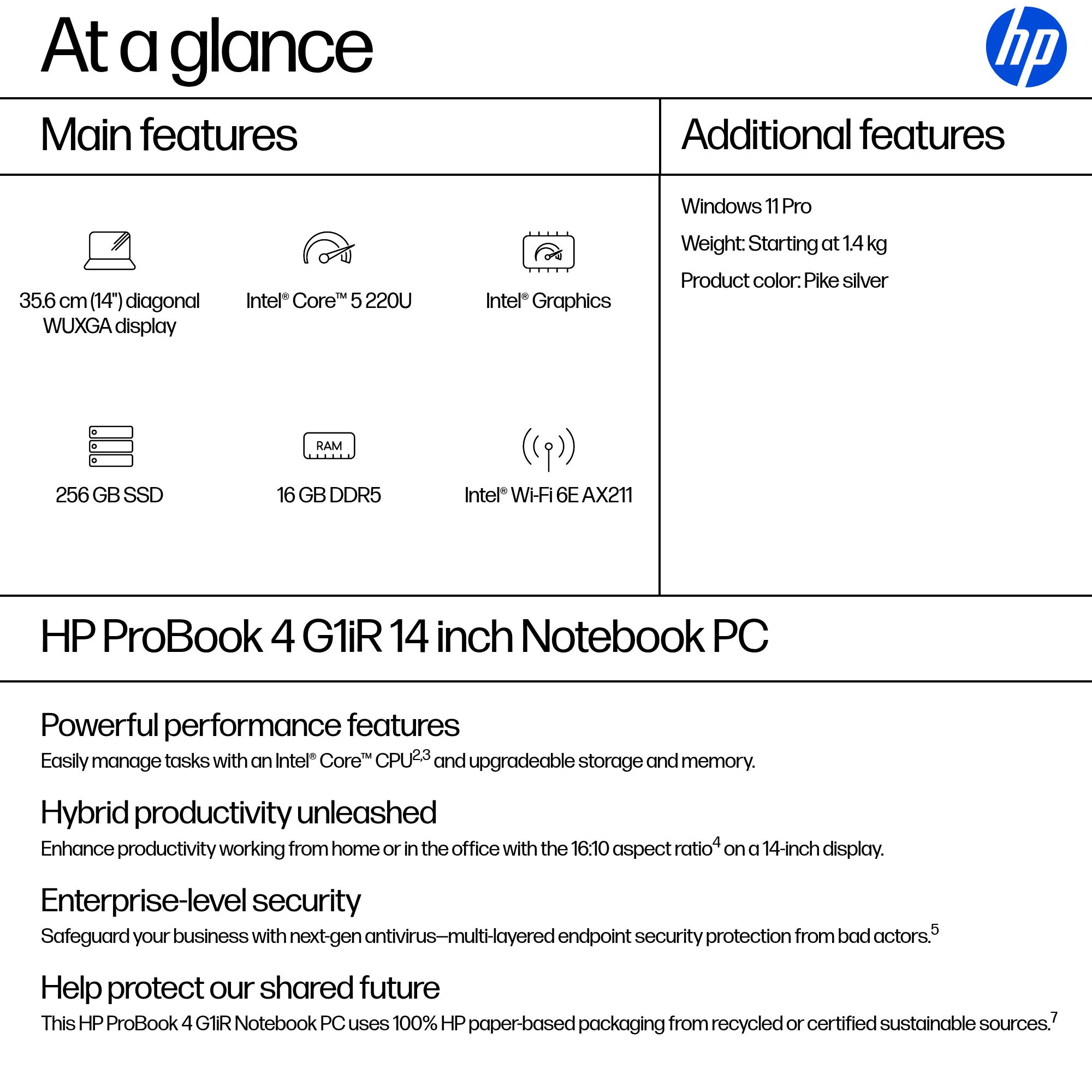 The HP ProBook 4 G1iR 14-inch Notebook PC provides growing businesses with commercial-grade performance, multi-layered endpoint security[5], and durability in an easily upgradeable design. Powered by the latest Intel processor[2] and long battery life, this feature-rich PC is future-ready for long-term productivity and helps enable hybrid work.