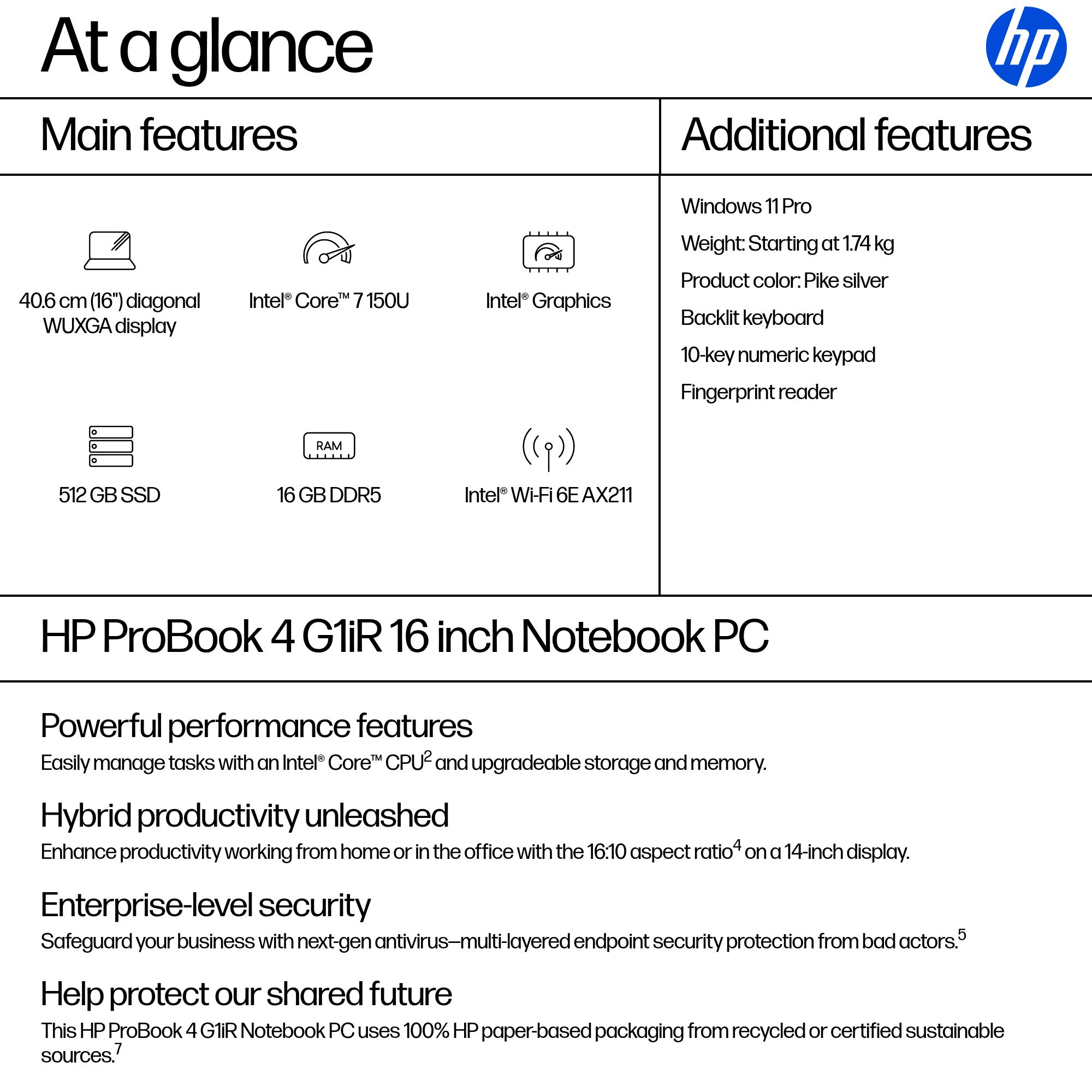 HP ProBook 4 G1iR Intel Core 7 150U Laptop 40.6 cm (16") WUXGA 16 GB DDR5-SDRAM 512 GB SSD Wi-Fi 6E (802.11ax) Windows 11 Pro Silver