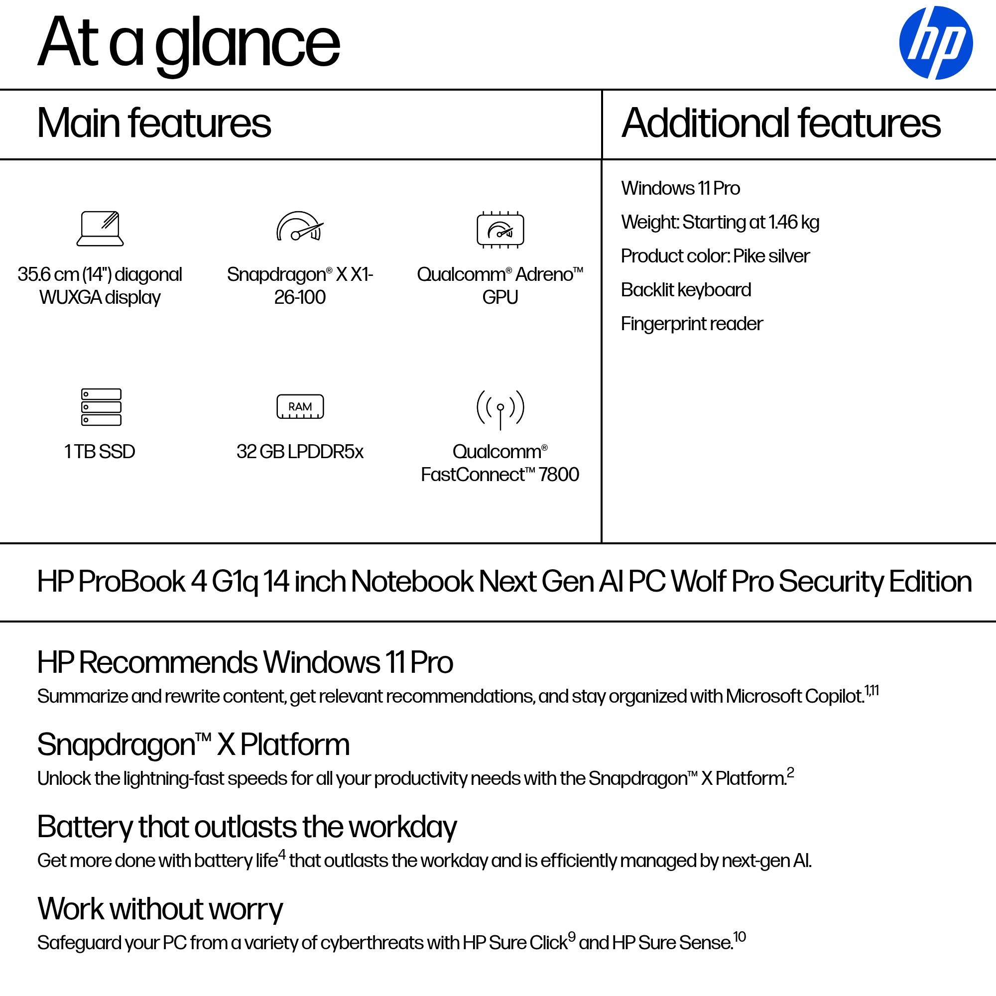 HP ProBook 4 G1q Next Gen AI PC Wolf Pro Security Edition Copilot+ PC Snapdragon X1-26-100 Laptop 35.6 cm (14") WUXGA 32 GB LPDDR5x-SDRAM 1 TB SSD Wi-Fi 7 (802.11be) Windows 11 Pro Silver