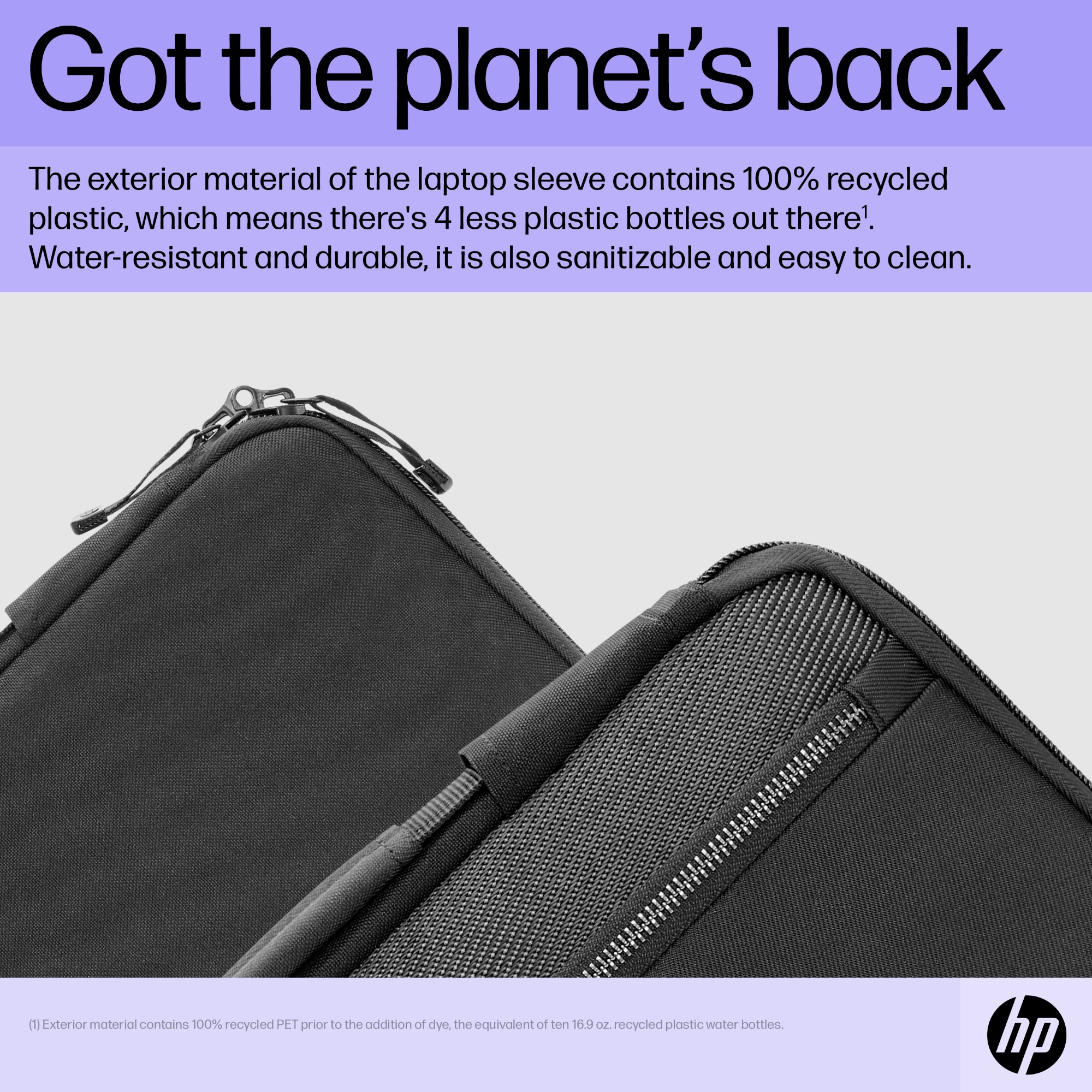 We've put an all-new spin on premium design and high quality materials. Crafted with functional style, this laptop sleeve fits your work or life needs with places and pockets for all your work essentials. Keep what's important close to you and keep your commitment to the planet with the external material containing 100% recycled plastics[1].