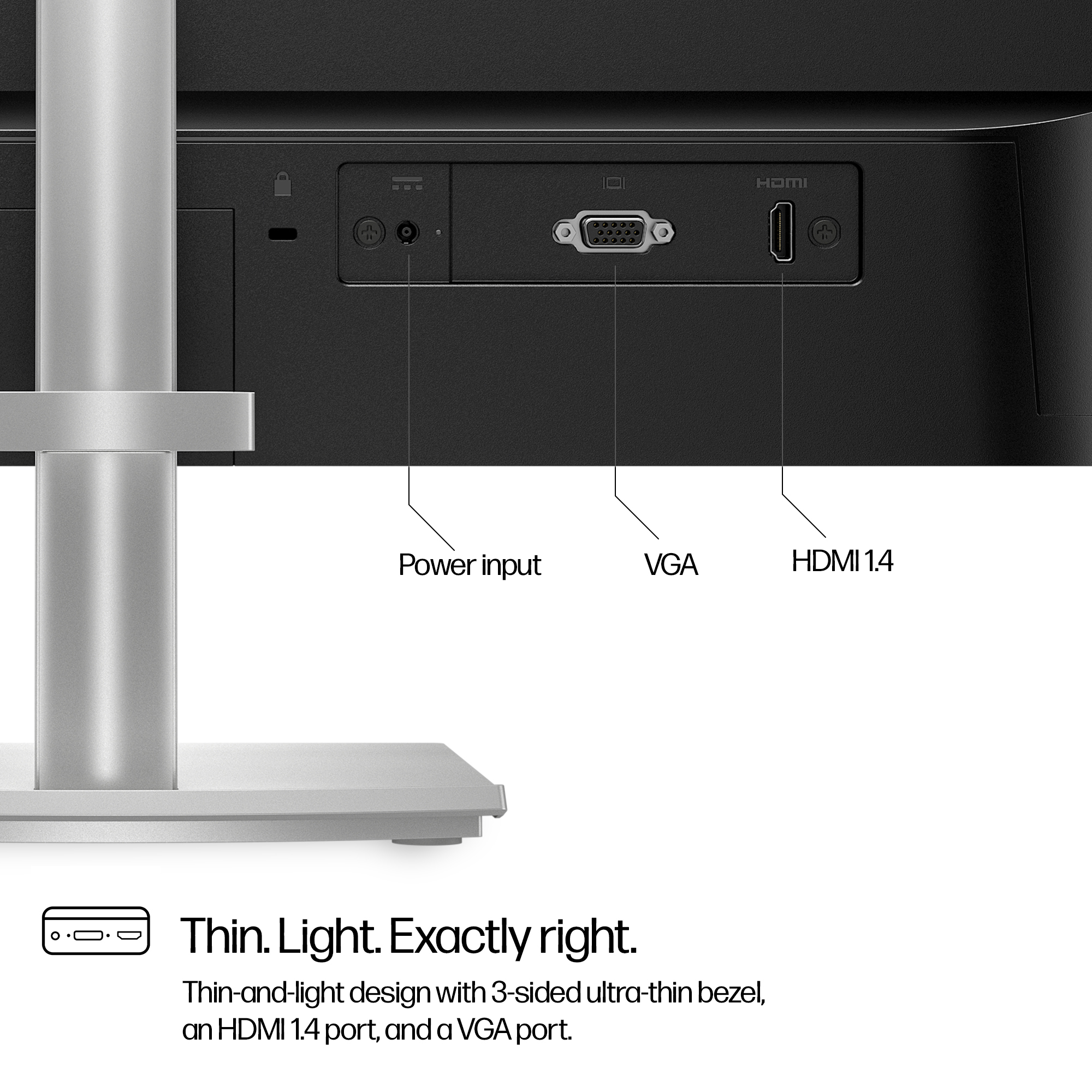 Discover a beautiful 23.8" FHD monitor with a thin-and-light design and simplified cable management that fits your style and maximizes your space. Its sleek, 3-sided ultra-thin bezel lets you stay immersed and focused to what’s on screen. Pair a second monitor to create a virtually seamless expansive view, while keeping every device connected and ready with HDMI and VGA ports for a better way to be productive.
