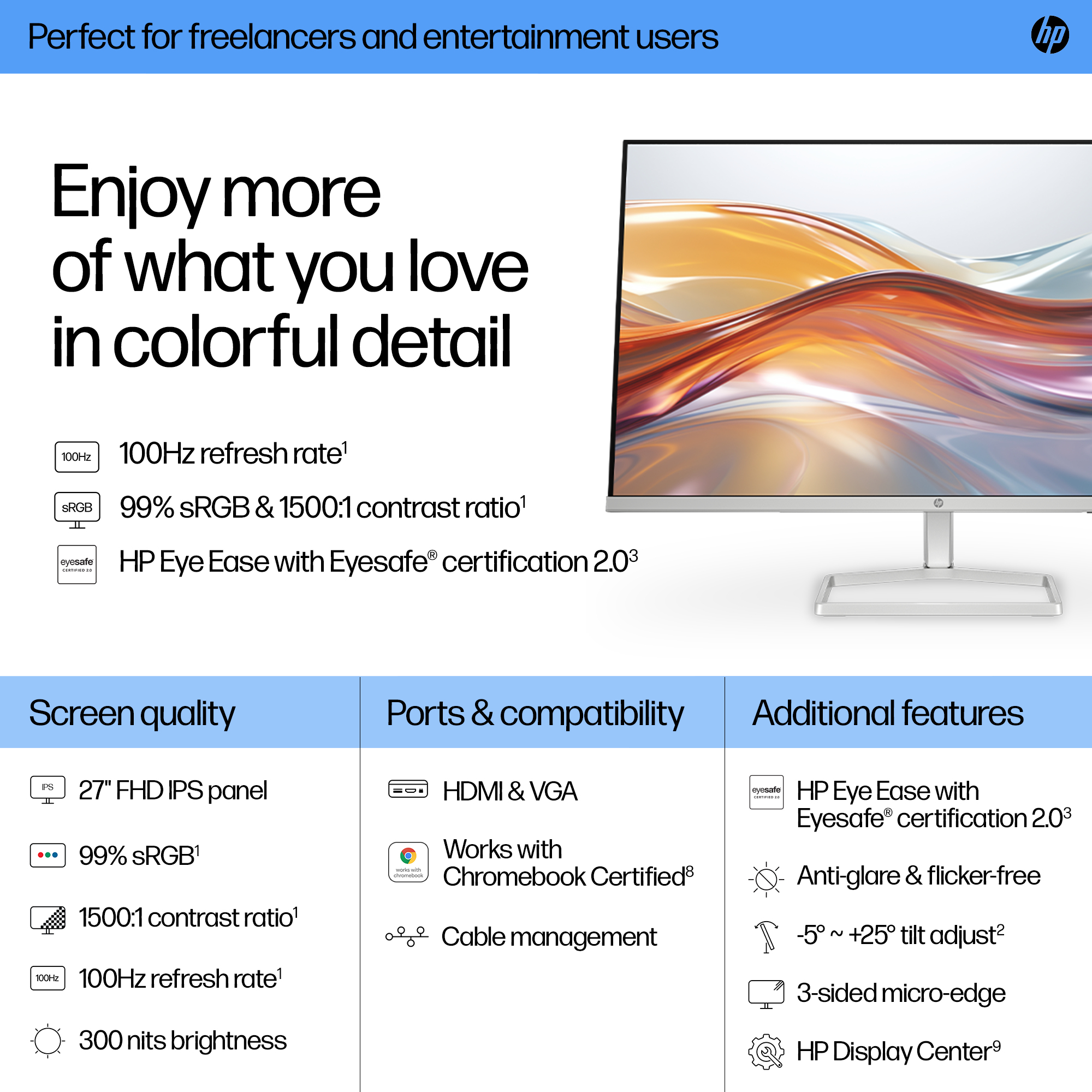 Sit back and soak in all the content you love with this exceptional 27" FHD monitor. Experience colorful imagery and vibrant detail like they were intended with 99% sRGB color, deep 1500:1 contrast ratio, and 300 nits brightness.<sup>[1]</sup> Its 100 Hz refresh rate delivers seamless scrolling and smooth, stutter-free viewing.