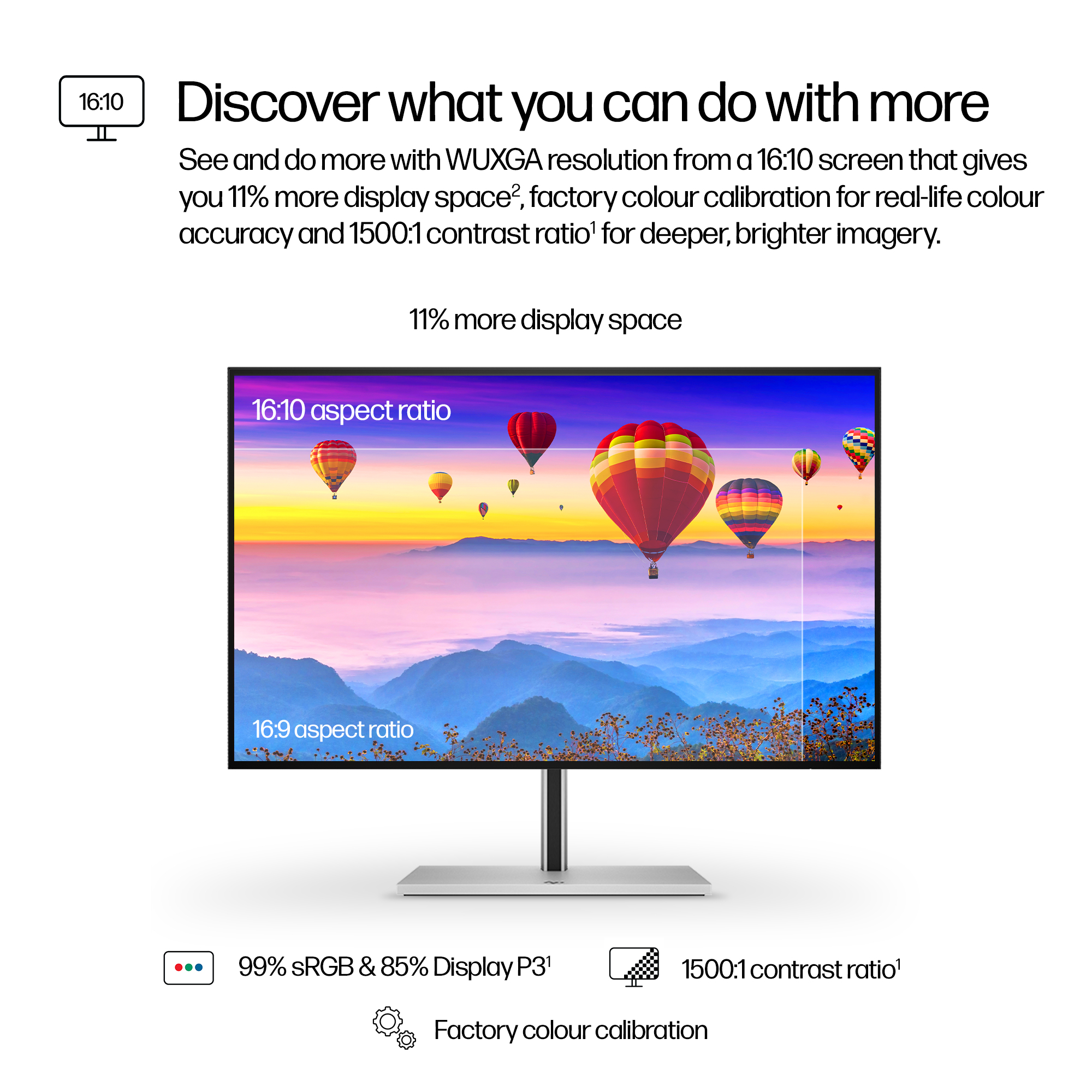 See your work take on a whole new dimension on a large, smooth screen with vibrant, accurate colors right out of the box. See every detail pop thanks to the deeper shadows and brighter highlights of 1500:1 contrast ratio.[1] enjoy 99% sRBG and 85% Display P3 color gamuts with factory color calibration for remarkable, real-life color accuracy that stays consistent from screen to screen. This 16:10 screen with WUXGA resolution gives you 11% more display space[2] so you can see—and do—more.