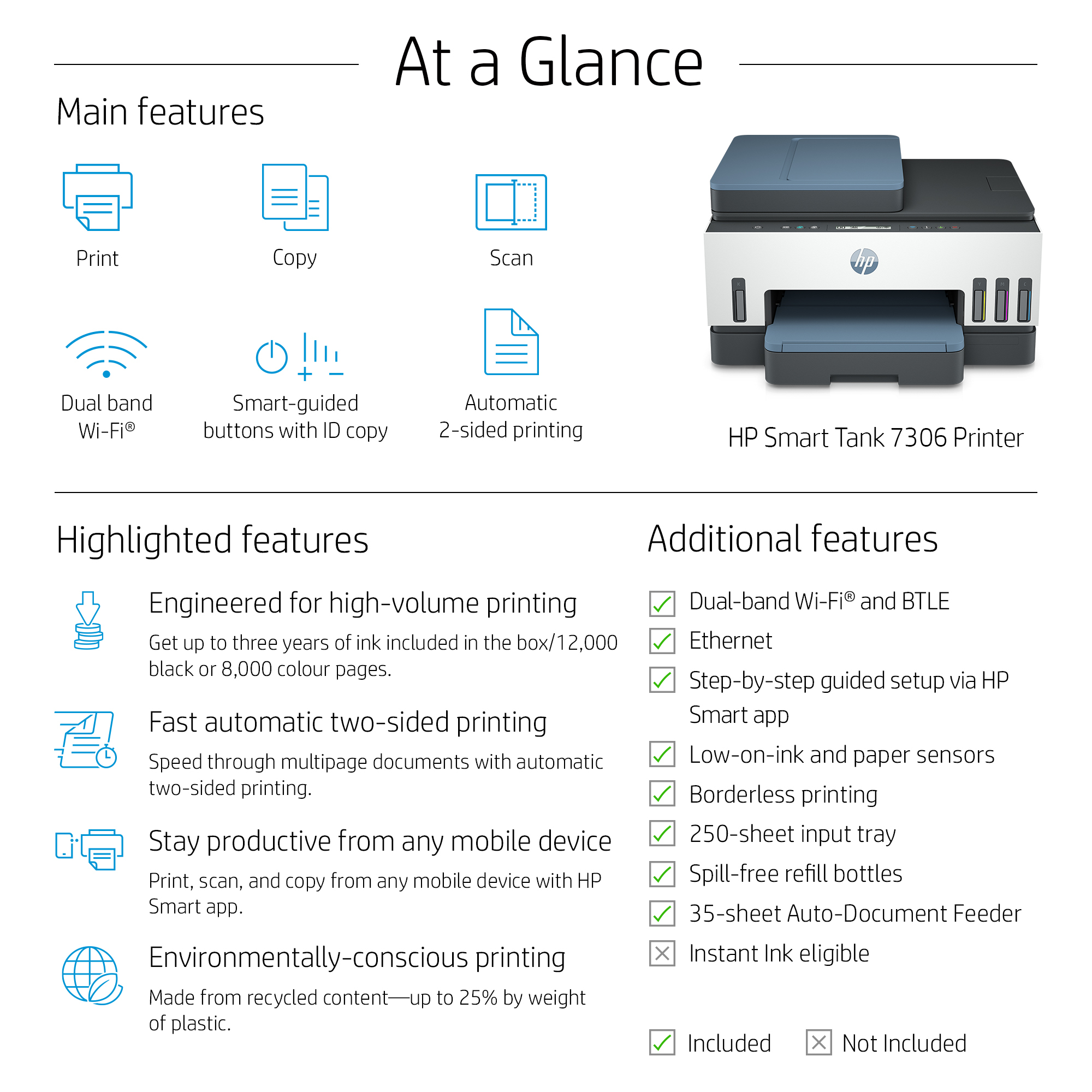 | Box contents | HP Smart Tank 7306 All-in-One; 2 x HP 32XL Black Original Ink Bottle; HP 31 Cyan Original Ink Bottle; HP 31 Magenta Original Ink Bottle; HP 31 Yellow Original Ink Bottle; HP Black Printhead; HP Tri-color Printhead; Ink caution flyer; Repacking flyer; Setup guide; Reference guide; Regulatory flyer; PT flyer; RoH-EAC Regulatory flyer; Power cord; Extended warranty flyer. For more information about fill and yield, see http://www.hp.com/go/learnaboutsupplies |