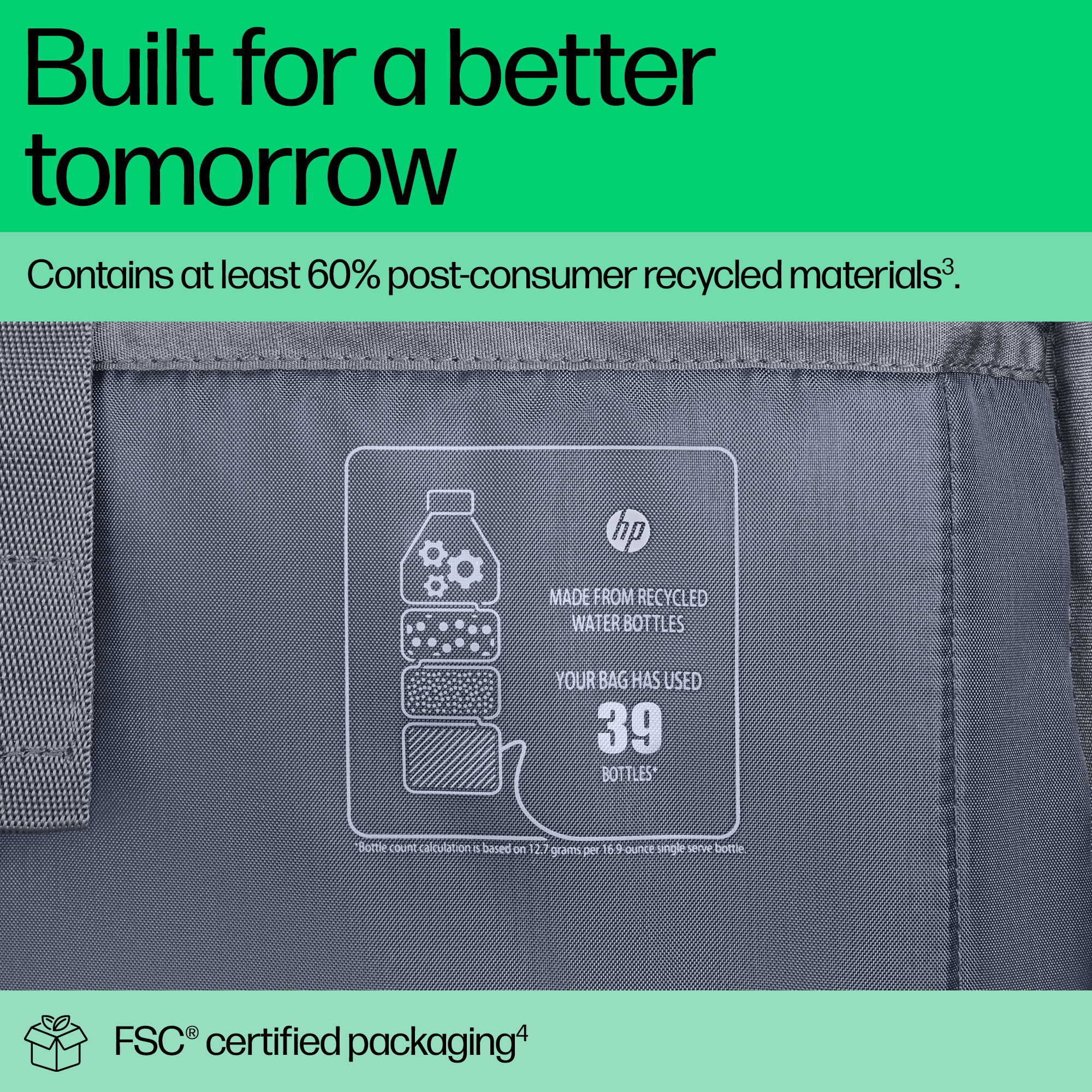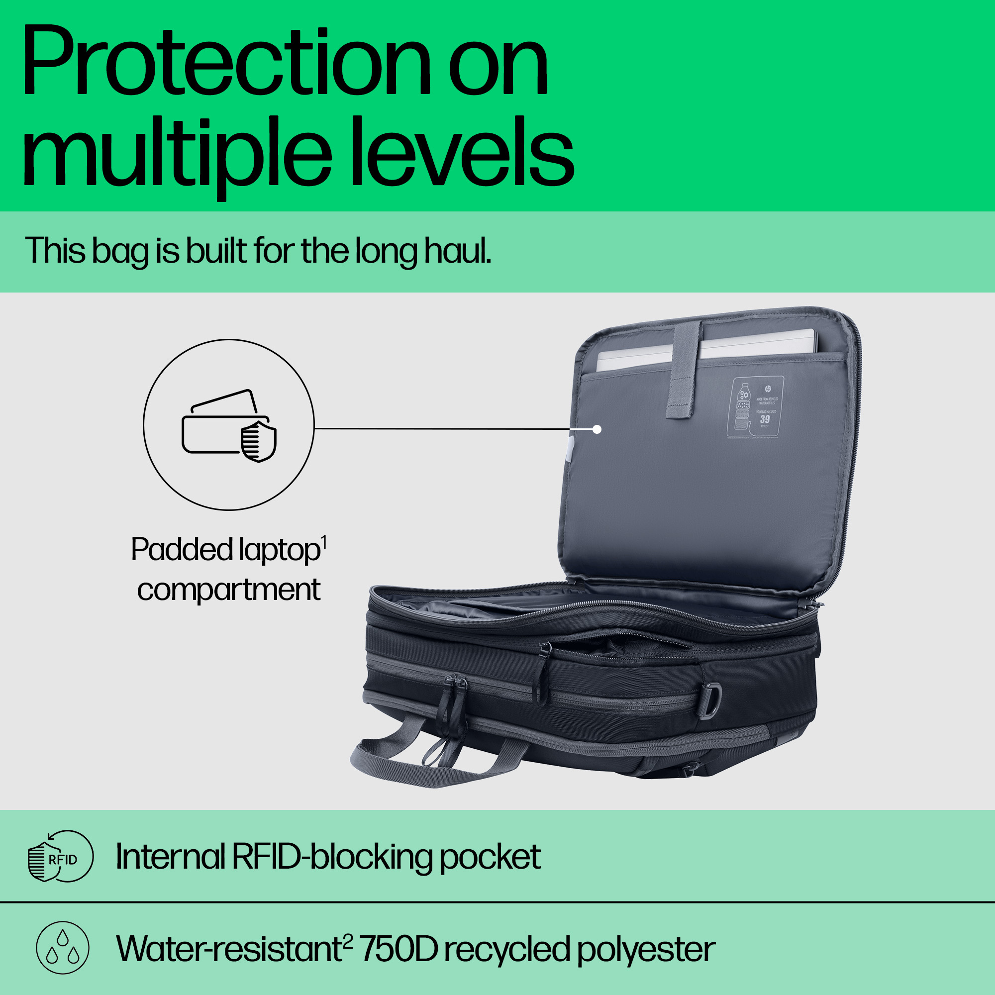 This bag is built for the long haul with durable, water-resistant<sup>[2]</sup> 750D recycled polyester. Padded compartments safeguard your laptop<sup>[1]</sup> and accessories from bumps and bruises, while the RFID-blocking pocket and lockable, anti-puncture zippers<sup>[3]</sup> deter theft.