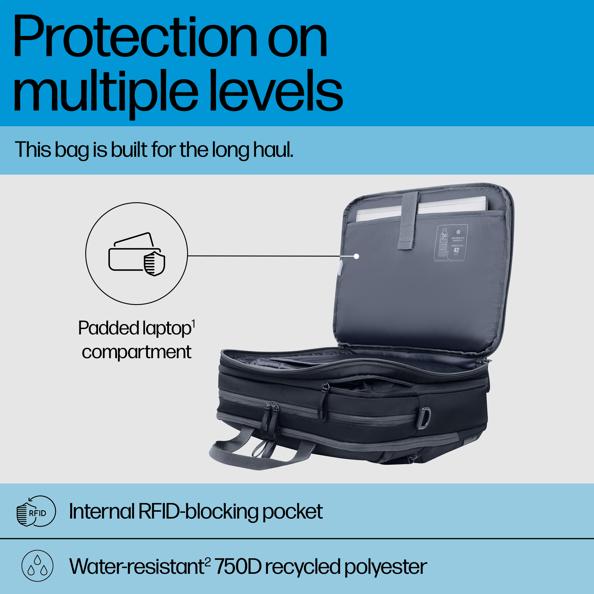 This backpack is built for the long haul with durable, water-resistant<sup>[2]</sup> 750D recycled polyester. Padded compartments safeguard your laptop<sup>[1]</sup> and accessories from bumps and bruises, while the RFID-blocking pocket and lockable, anti-puncture zippers<sup>[3]</sup> deter theft.