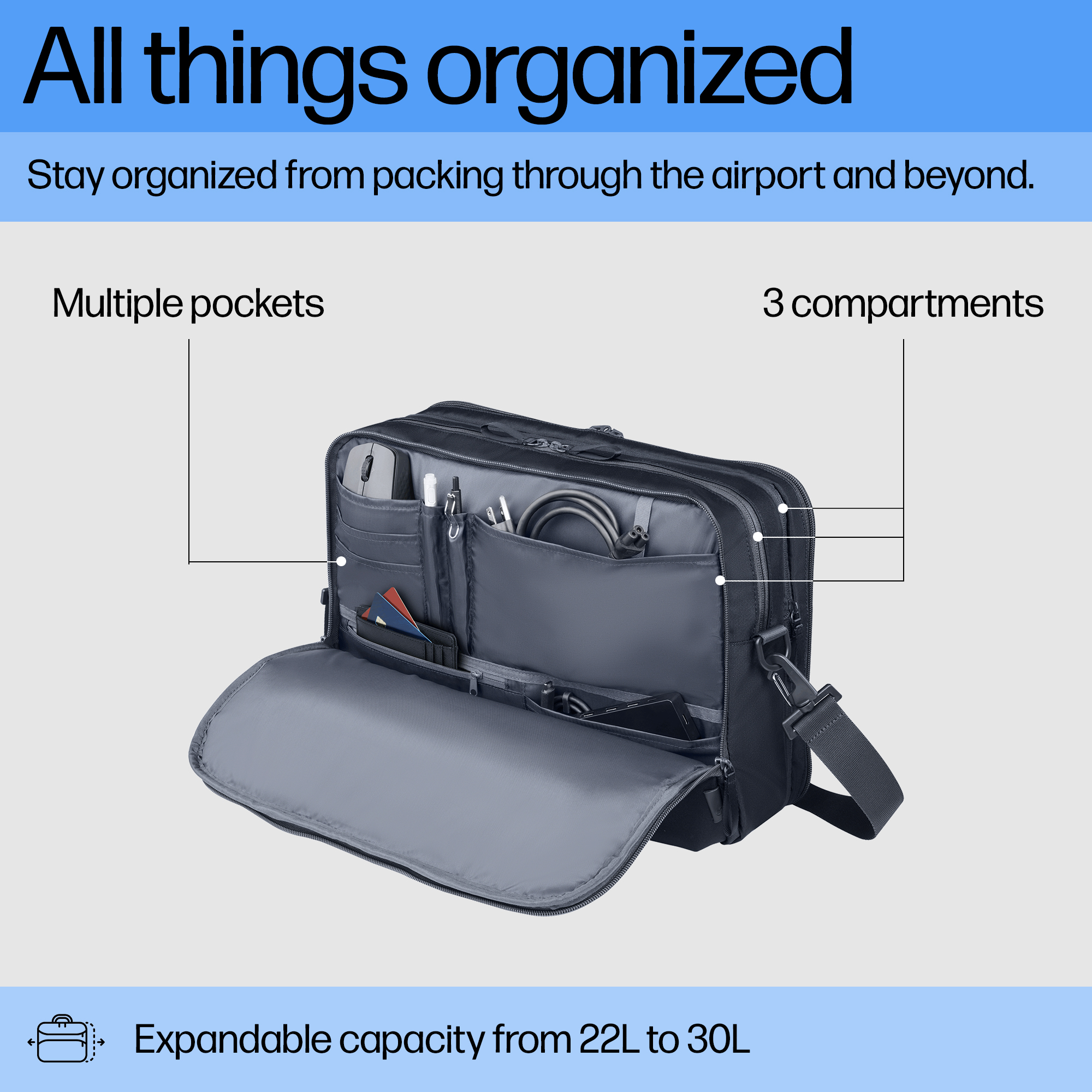 Stay organized with three compartments and multiple pockets, including two quick access pockets, for all your essentials. Expand the capacity from 22L to 30L to fit everything you need for your business trip–tech, clothing, packing cubes, and more–in one bag.