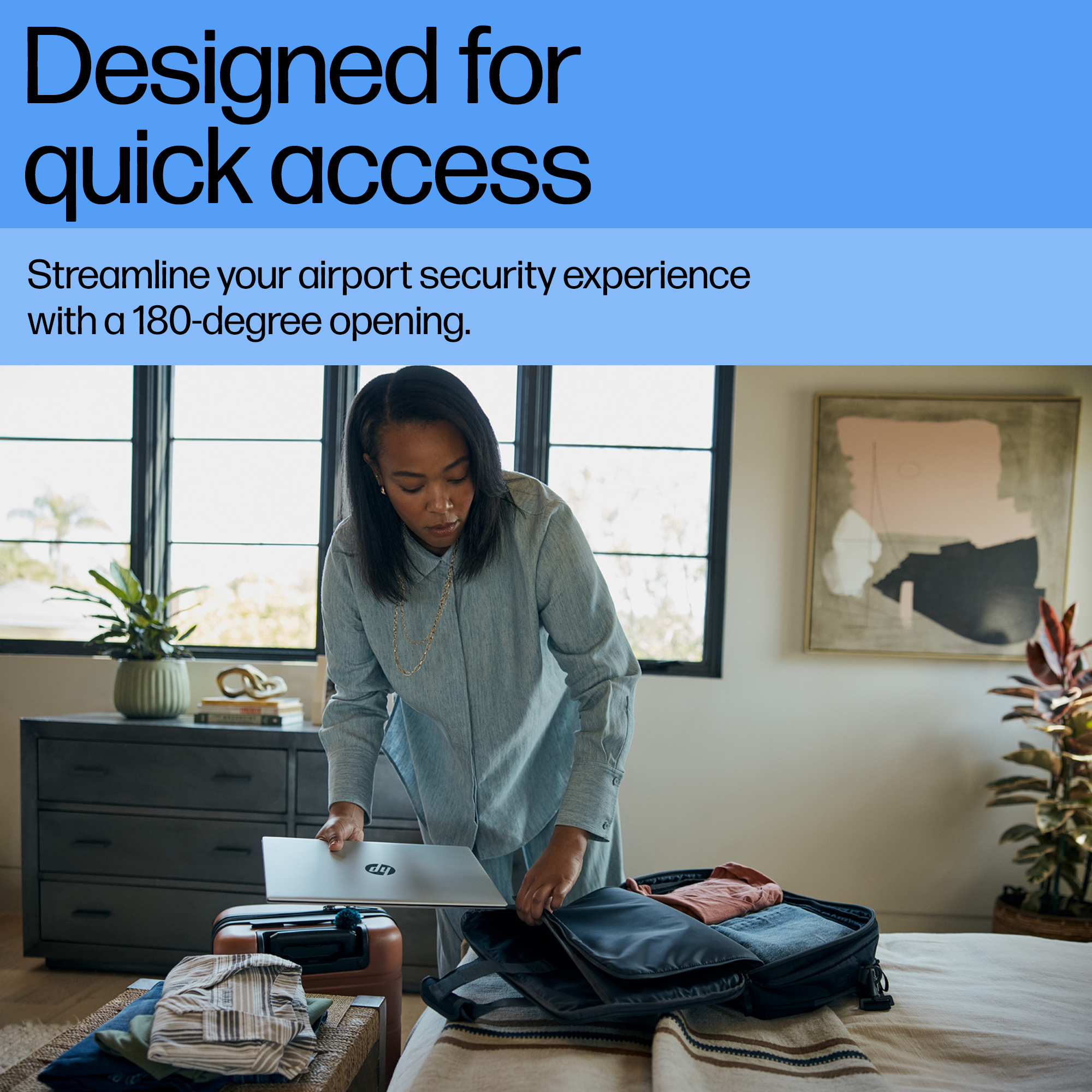 Streamline your security experience with a travel laptop backpack that provides easy access to all your belongings. The 180-degree opening lets you quickly grab whatever you need in the moment—laptop<sup>[1]</sup>, toiletries, liquids, accessories, and more.