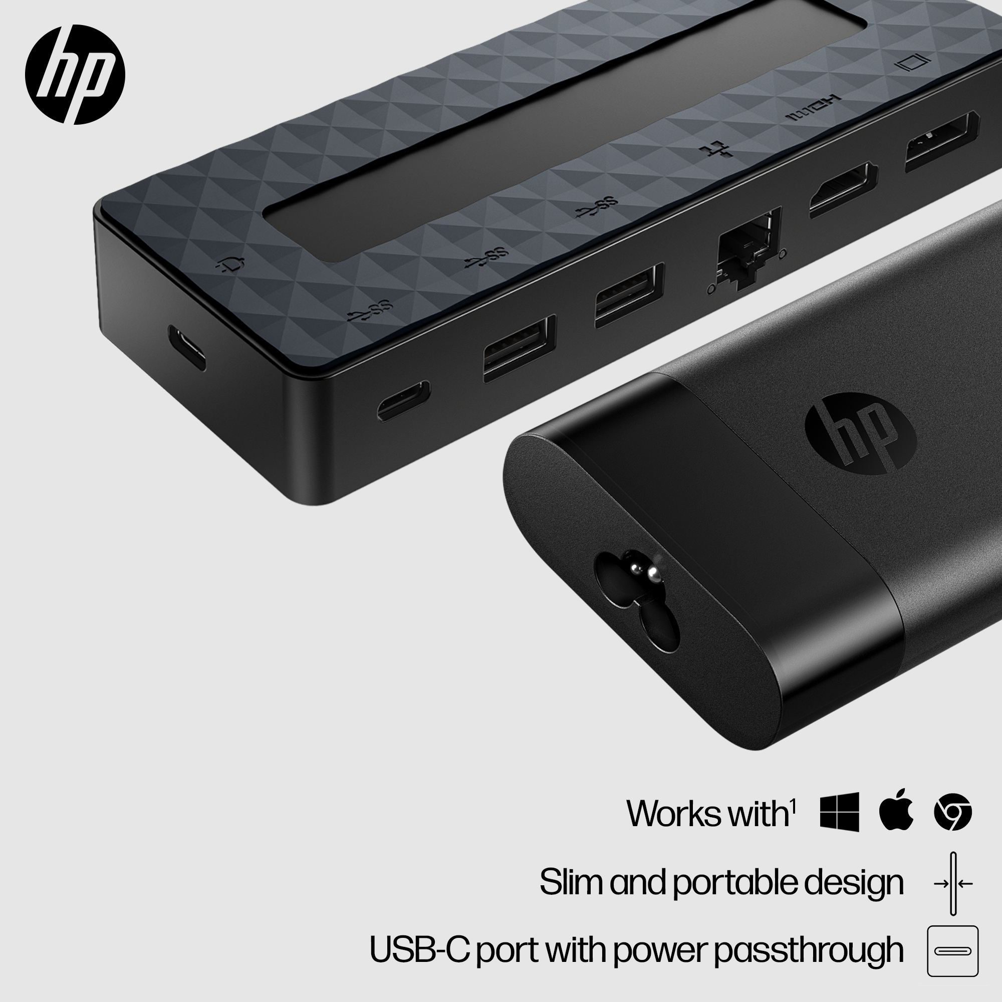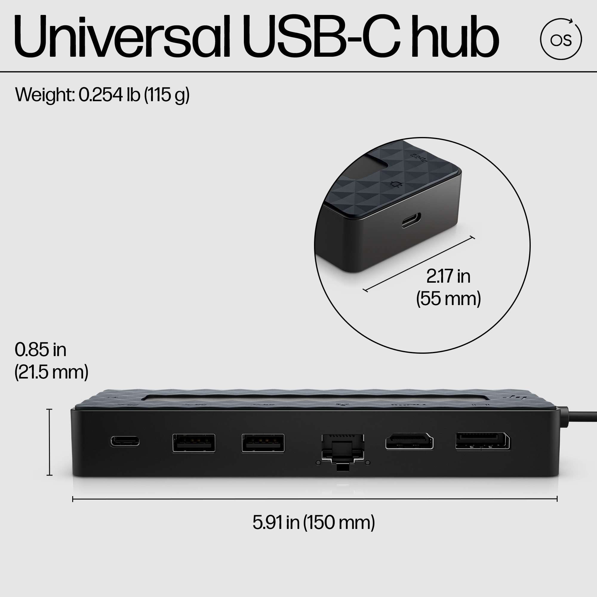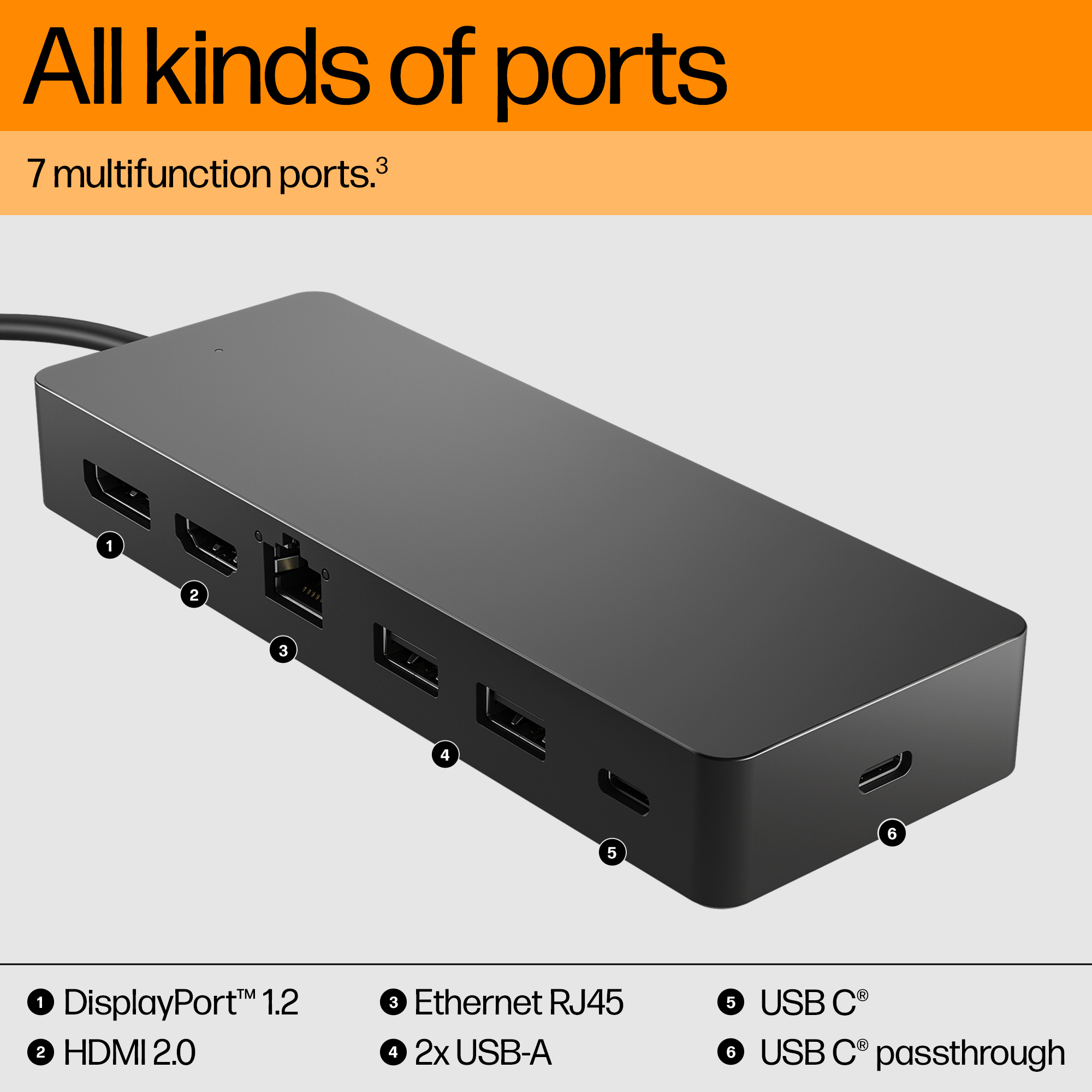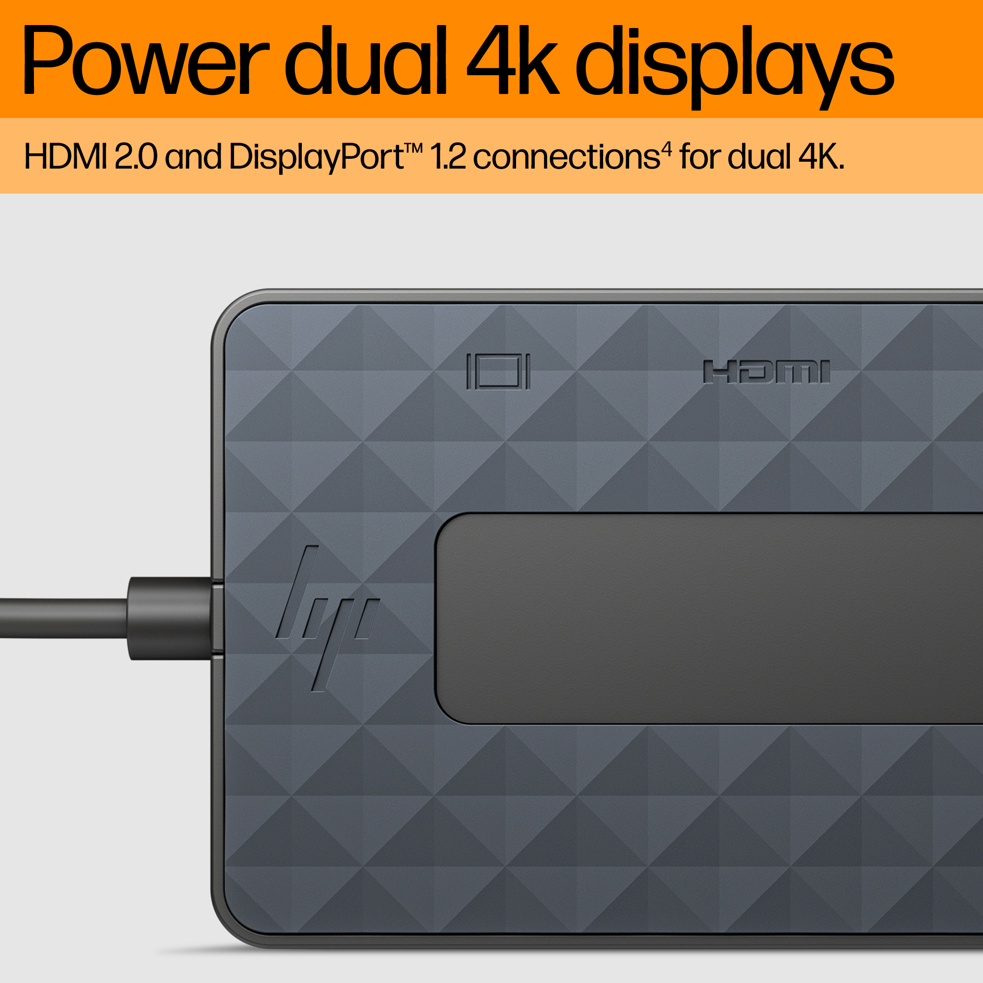 Unlock new possibilities with the HP Universal USB-C Multiport hub[1], now supporting any USB-C compatible PC. 7 ports, 1 power and data passthrough cable, and many peripherals to plug and play however you like. It also supports dual 4K displays via HDMI 2.0 and DisplayPort™ 1.2. This hub is all you need to stay connected.