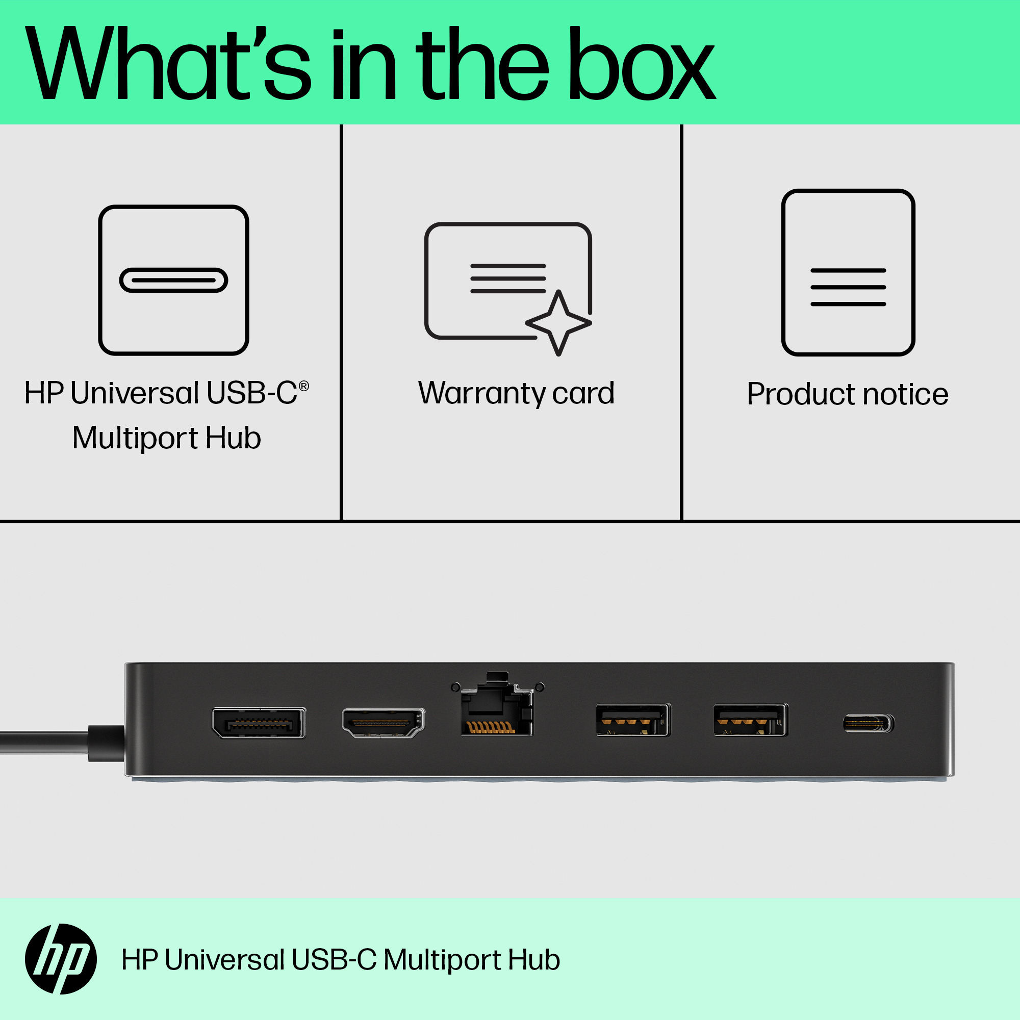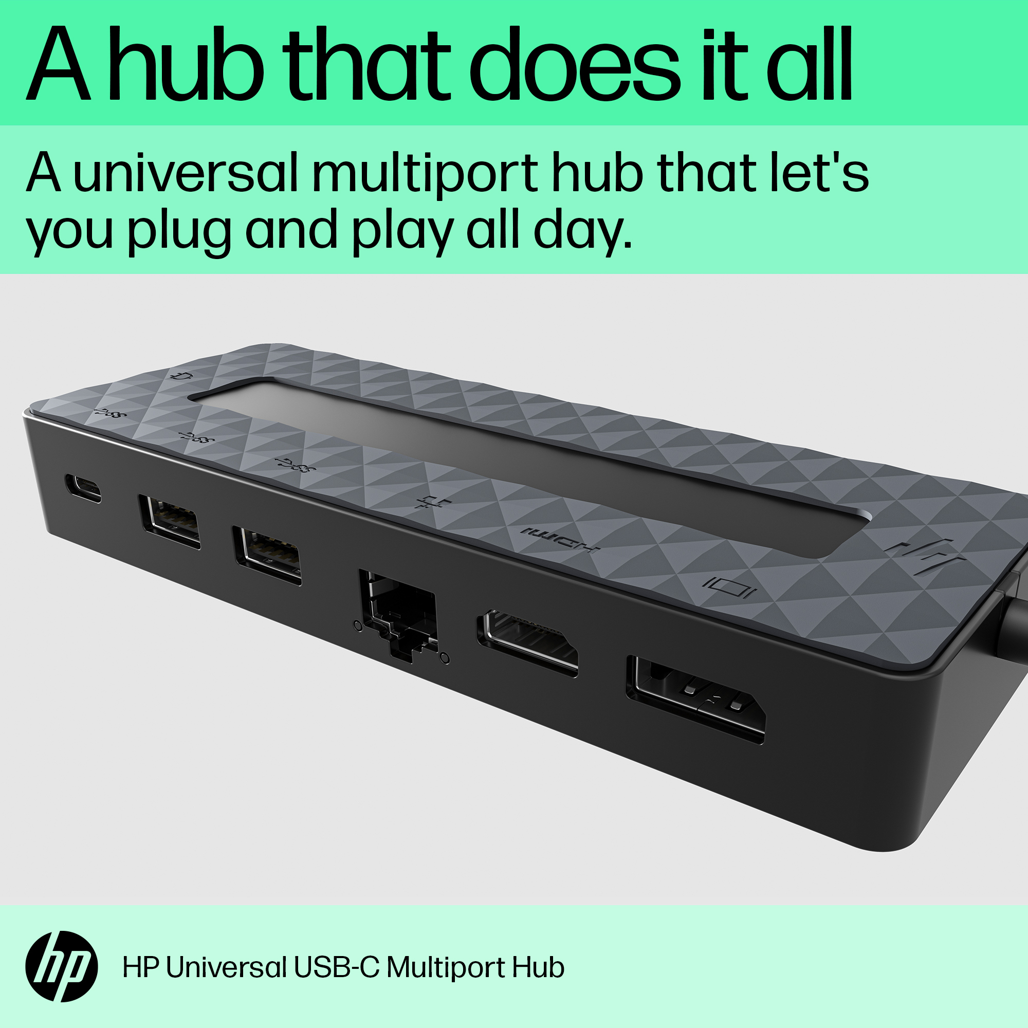 Unlock new possibilities with the HP Universal USB-C Multiport hub, now supporting any USB-C[1] compatible PC. 7 ports, 1 power and data passthrough cable, and many peripherals to plug and play however you like. It also supports dual 4K[2] displays via HDMI 2.0 and 1 DisplayPort™ 1.2. This hub is all you need to stay connected.