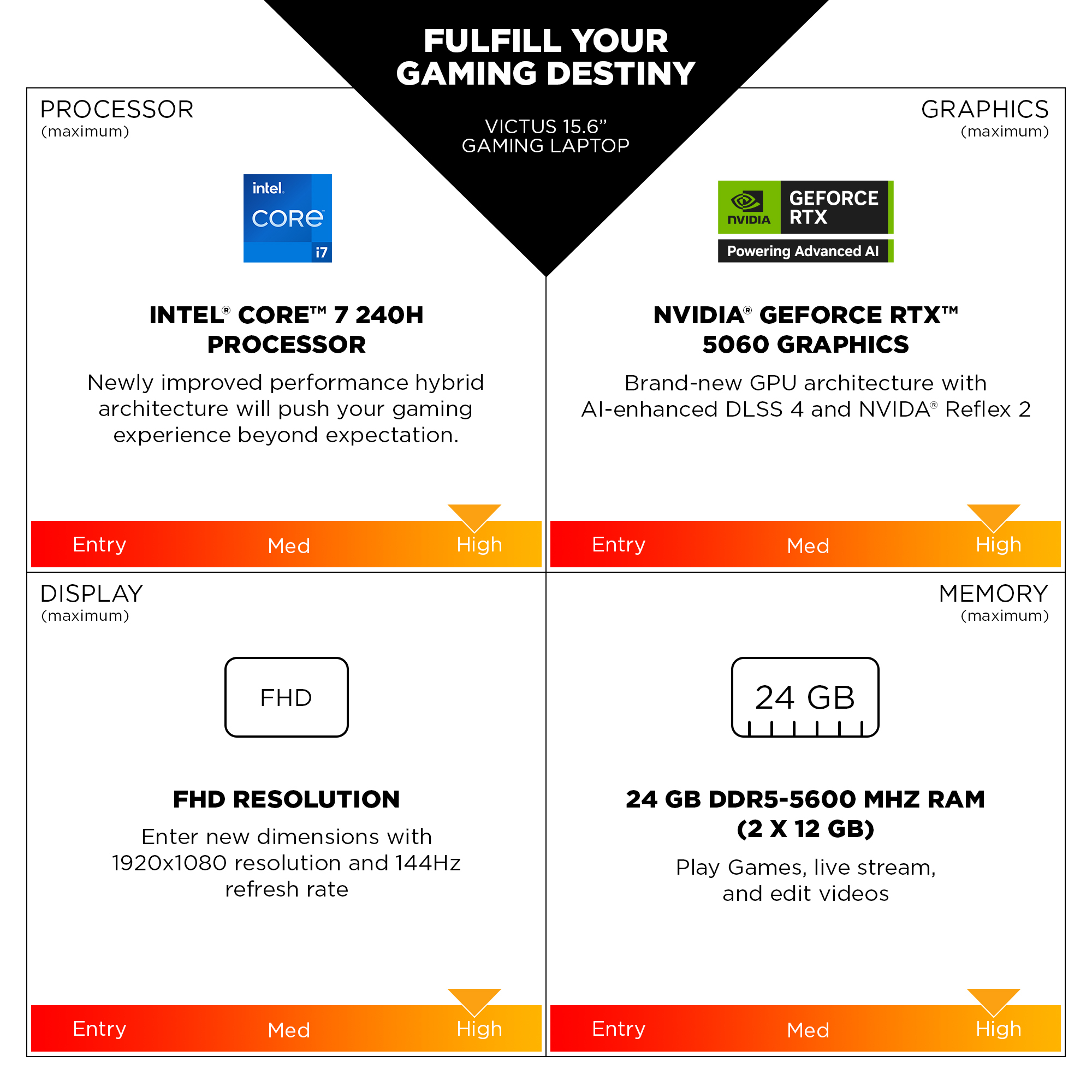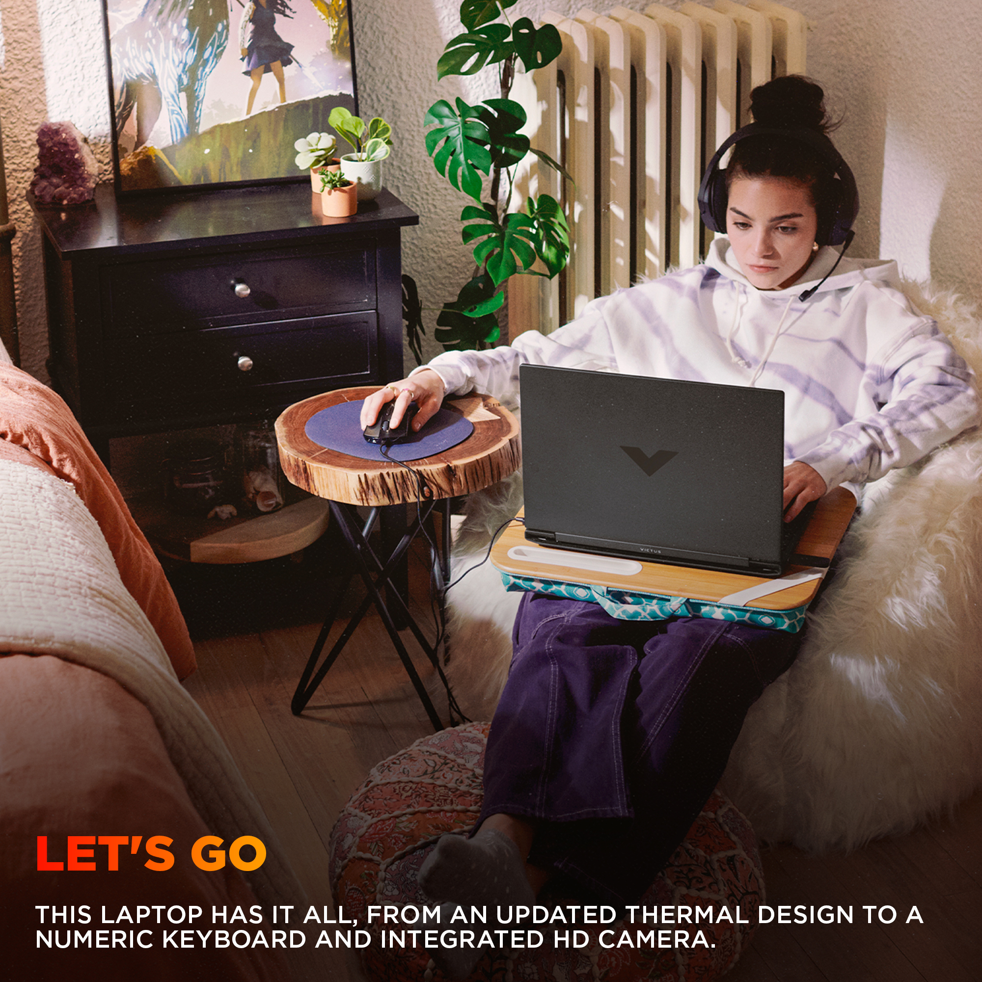 The HP Victus Laptop is made for great PC gaming on the go. This sleek machine touts a powerful Intel Processor[1] and NVIDIA graphics. This laptop’s design is just as impressive as its hardware with plenty of color options[2], updated thermals and a webcam camera with Temporal Noise Reduction.