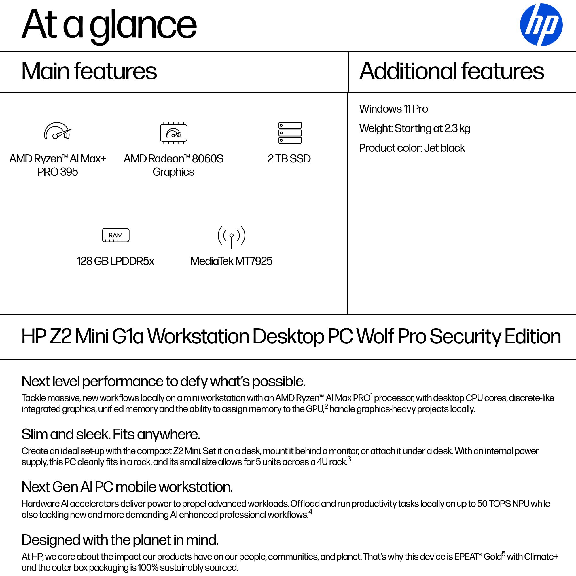HP Z2 G1a Wolf Pro Security Edition Copilot+ PC AMD Ryzen AI Max+ PRO 395 128 GB LPDDR5x-SDRAM 2 TB SSD Windows 11 Pro Mini PC Workstation AI Workstation, AI PC Black