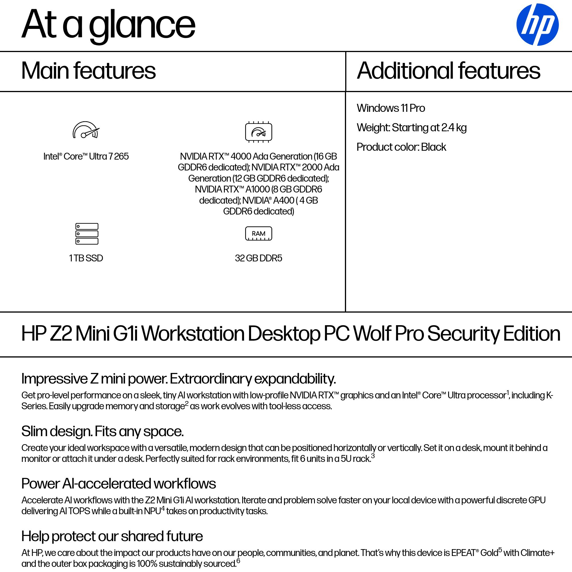 HP Z2 Mini G1i Wolf Pro Security Edition Intel Core Ultra 7 265 32 GB DDR5-SDRAM 1 TB SSD Windows 11 Pro Mini PC Workstation AI Workstation, AI PC Black