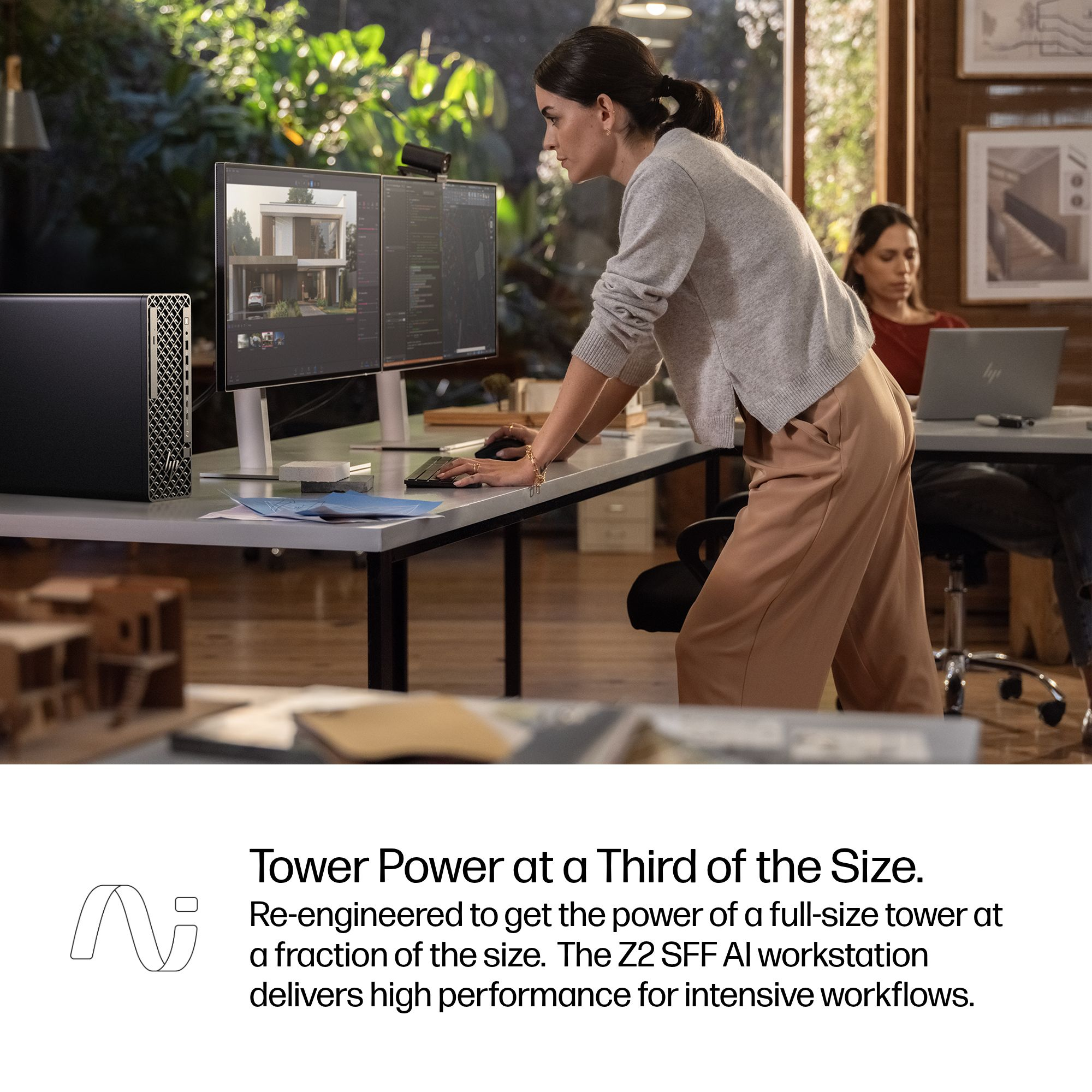 Design, simulate, and real-time ray trace on the Z2 SFF AI workstation, with low-profile NVIDIA RTXTM graphics and an Intel® Core™ Ultra processor,[1] including K-Series. Easily upgrade memory[2] and storage as work evolves with tool-less access.