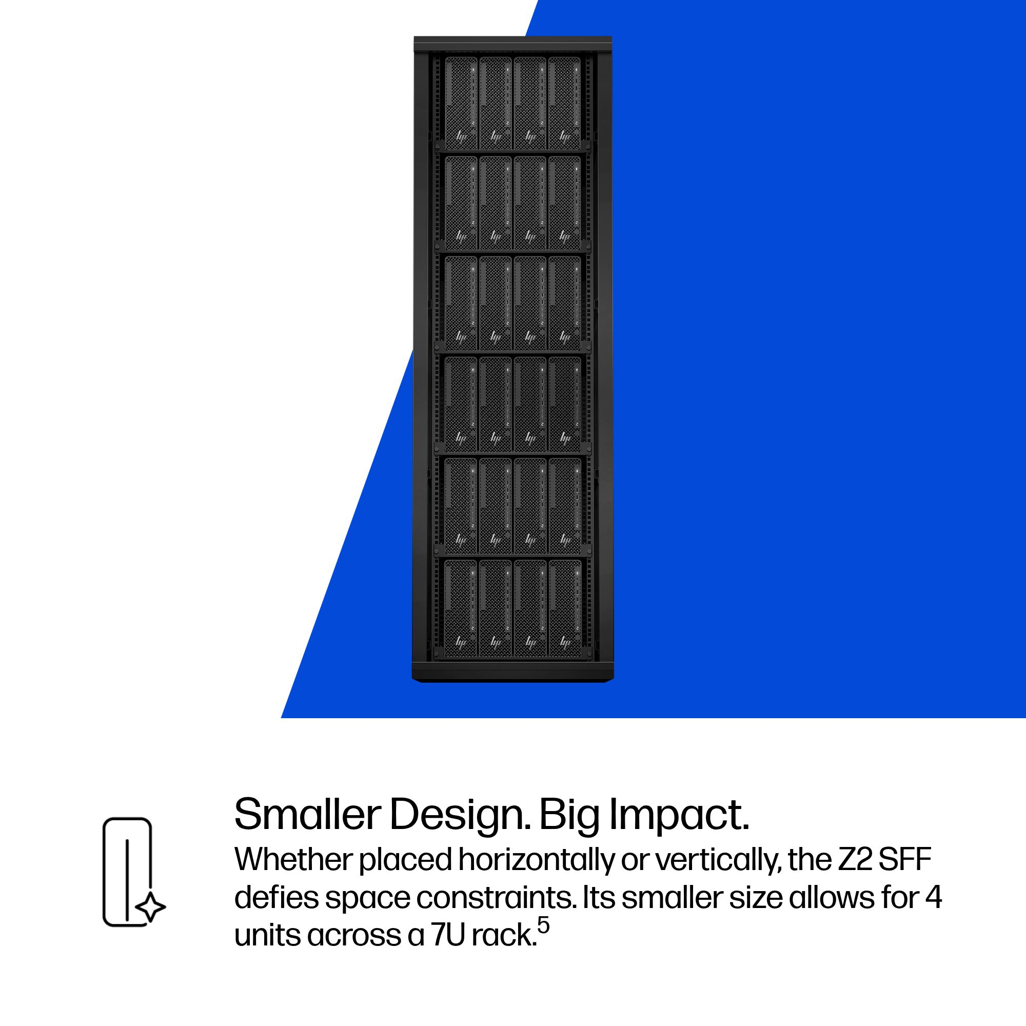 Whether placed horizontally or vertically, the Z2 SFF defies space constraints. Its smaller size allows for 4 units across a 7U rack.[3] Stylish yet purposeful venting improves airflow to enable powerful K-series CPUs and NVIDIA low profile GPUs.