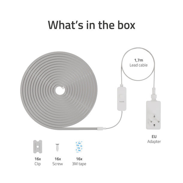 Simply plug in and connect to Bluetooth—no additional hub required. If you want to benefit from the full experience of the Hombli App and control from farther away, we recommend you combine the Rope with the Hombli Smart Bluetooth Bridge. The included mounting clips make it easy to secure the rope in any location, so you can start enjoying your smart lighting in minutes.