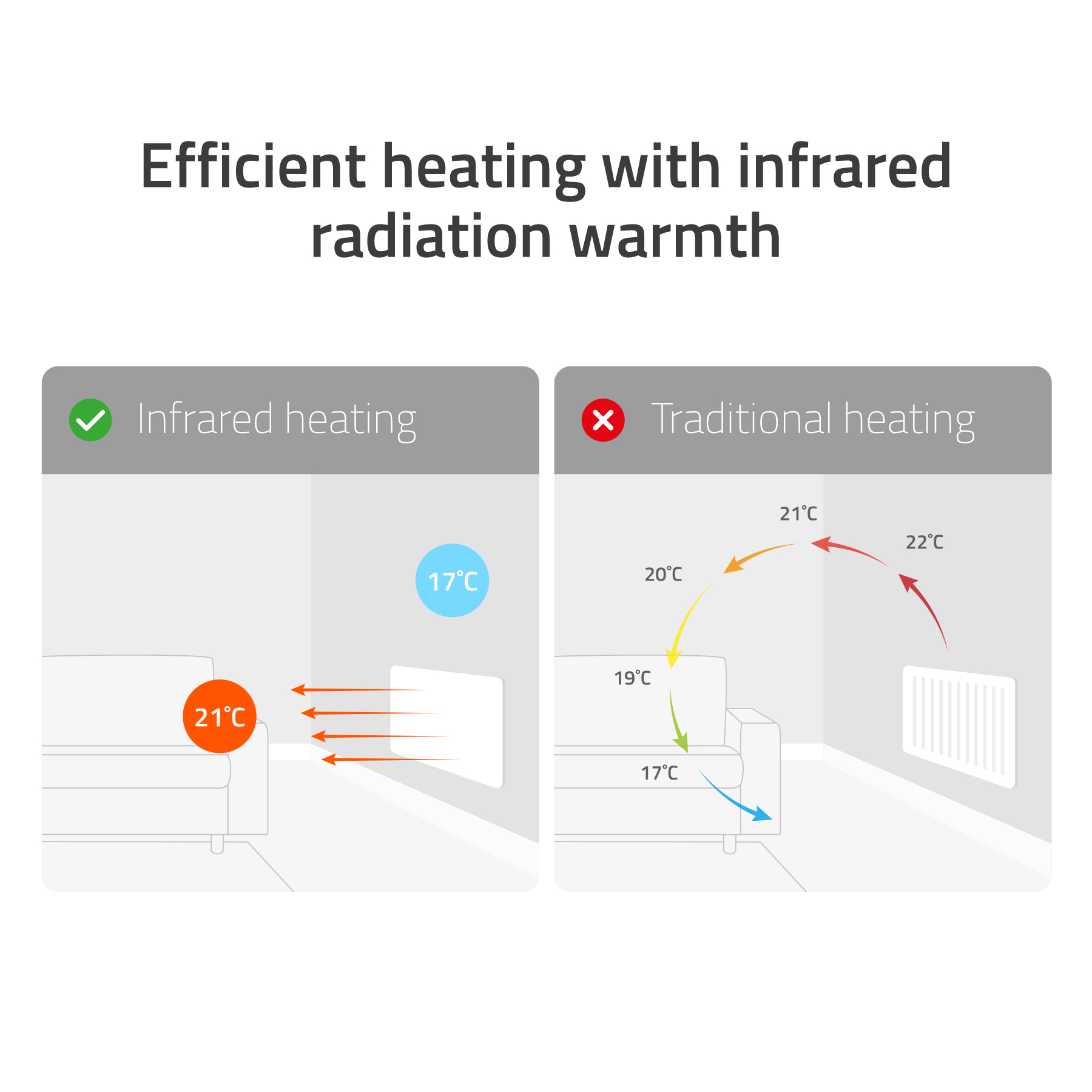 The Smart IR Panel Heater has an open-window detection, which turns off the heater when cold air is detected through an open door or window and precious heat will not disappear.
