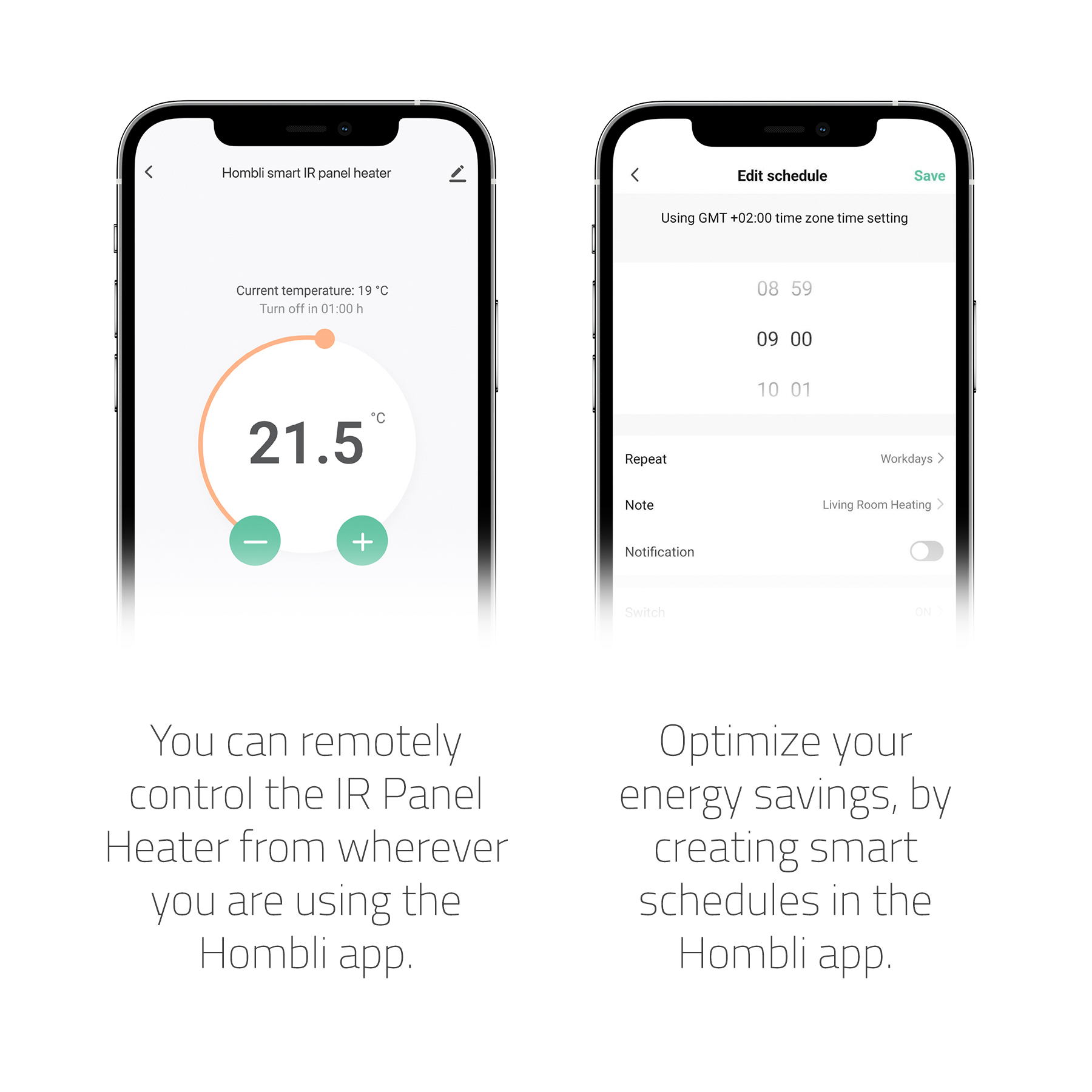 The Hombli Smart IR Panel Heater is one of the many Hombli smart home products that you can easily combine and control in the Hombli App. Combine multiple panel heaters in different rooms in your home with a smart schedule in the Hombli app.