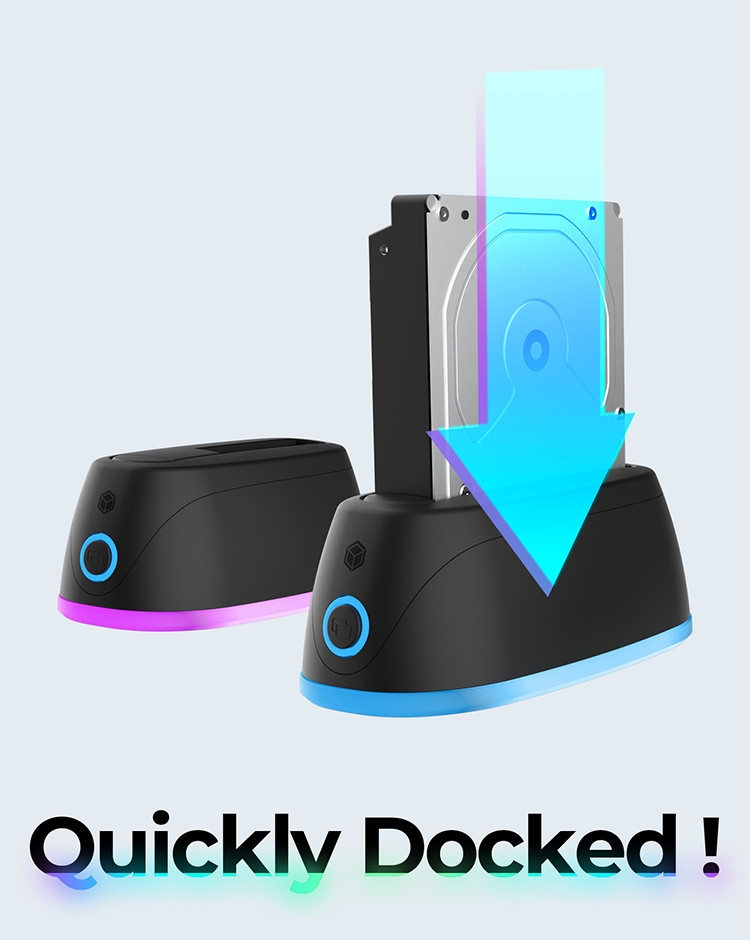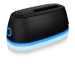 The ambient lighting extends once around the enclosure as a blue strip. The blue circular LED not only has a visual effect, but also indicates operation and access of the hard drive. This DockingStation complements your office or home office as a technically reliable design object.
