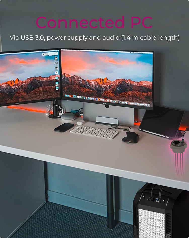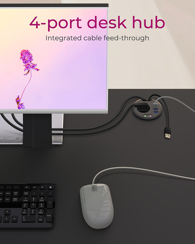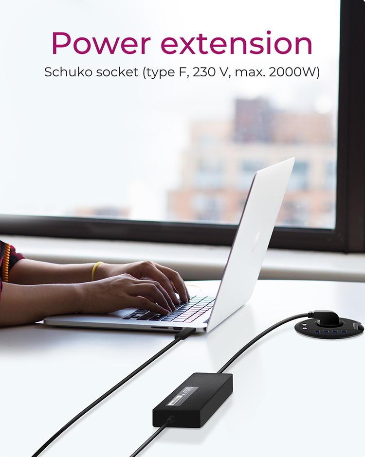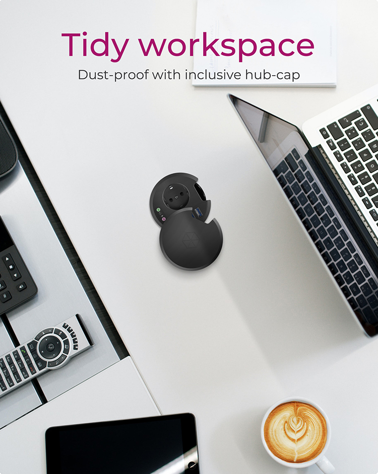 The IB-HUB1430 is the elegant solution for a tidy desk. It fits into existing holes (80 mm), is mounted without tools and offers enough space to feed several cables through.